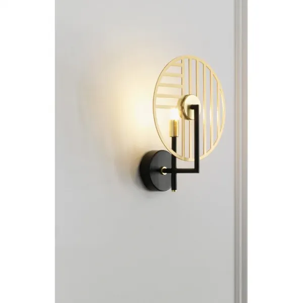 Бра Erto представляет собой золотистый матовый диск с вертикальными и горизонтальными полосками из металла, закрепленный на черном контрастном основании. Такое сочетание цветов делает внешний вид светильника более интересным и стильным. Необычный плафон бра скрывает небольшую LED лампочку, свет которой отражается от стены и равномерно рассеивается в пространстве.