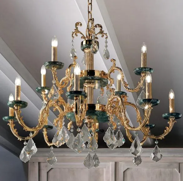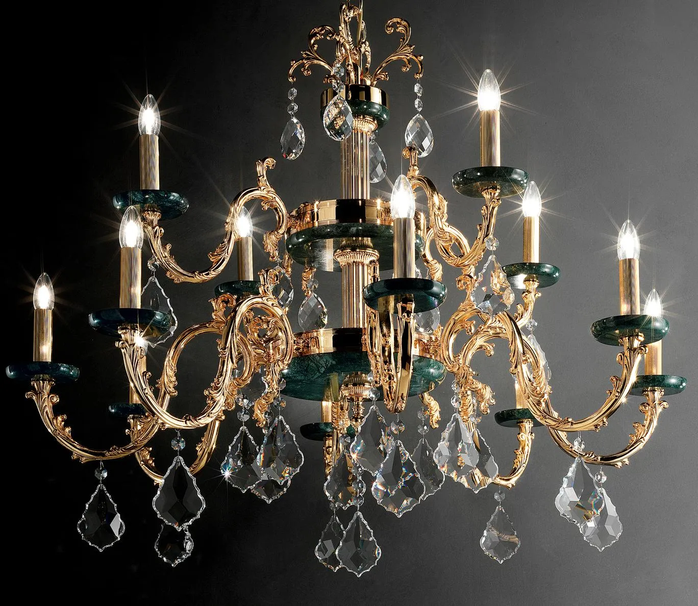 Каркас из латунного литья с позолотой, дисками и чашками из зеленого гватемальского мрамора или из розового португальского мрамора. Изделия этой серии украшены подвесками со стразами Сваровски.