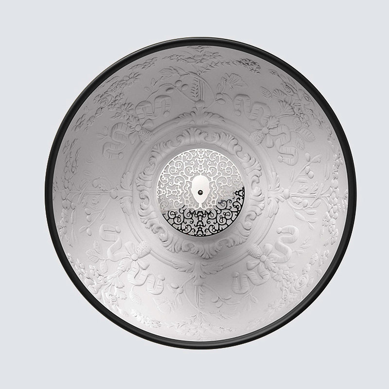 Подвесной светильник Skygarden 1 имеет полусферический абажур, изготовленный из механически обработанного гипса. Опора для гипсового рассеивателя выполнена из полированного алюминиевого сплава, отлитого под давлением. Видимая часть покрыта защитным слоем прозрачного лака. У светильника также есть держатель и крепежная подставка, изготовленные из темного поликарбоната, отлитого под давлением. Абажур покрыт лаком снаружи и белым внутри, где, стоя прямо под ним, можно увидеть оригинальный цветочный узор. За ним скрывается сверкающее и выдуваемое опаловое стекло, которое отбрасывает вниз мягкий, равномерный свет без бликов.