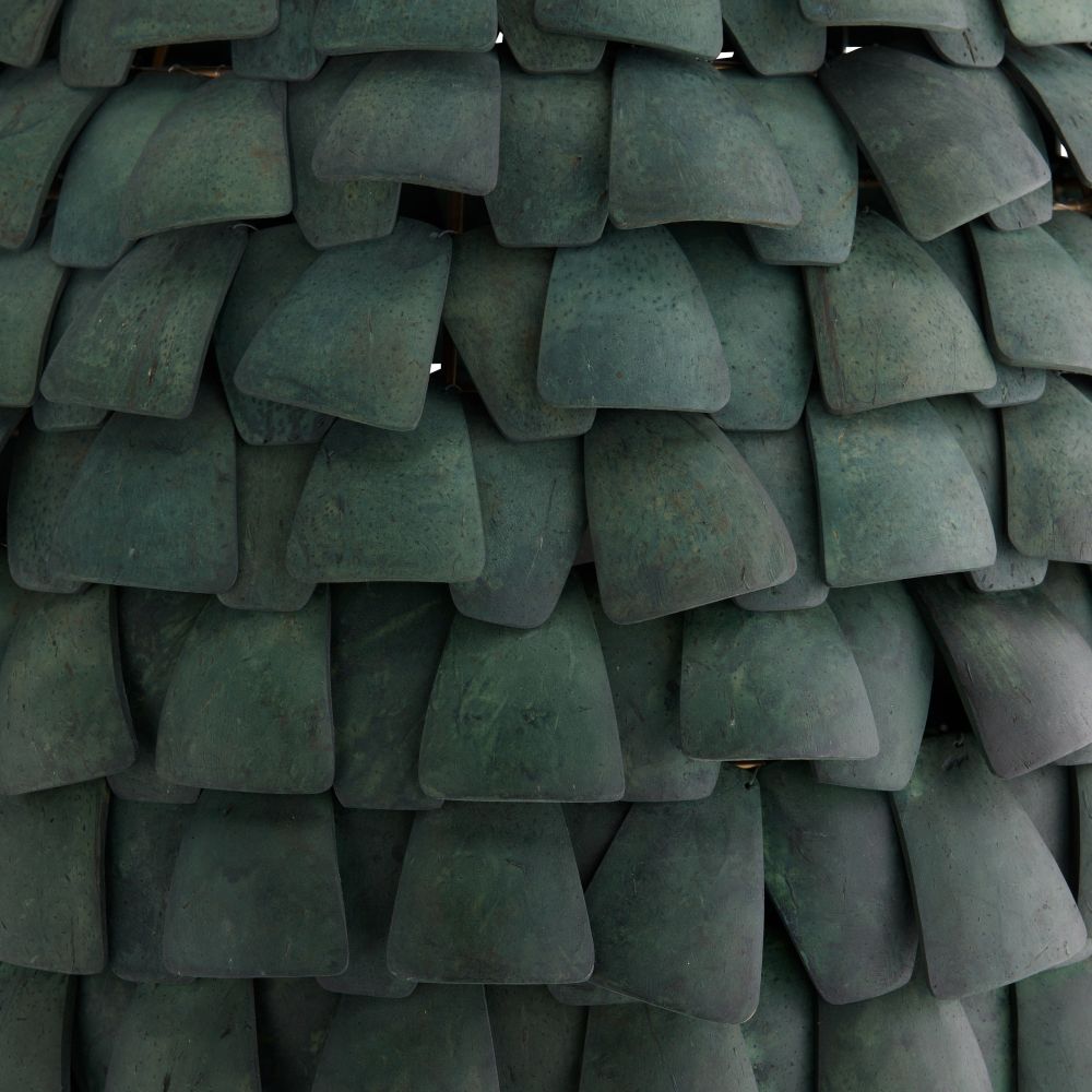 Форма светильника Ferndale словно черепица цвета кокосовой скорлупы, окрашенной в эвкалиптовый оттенок, нанесенная слоями, создавая эффект рыбьей чешуи.
