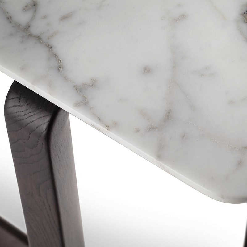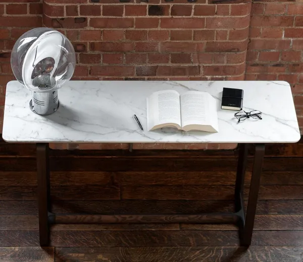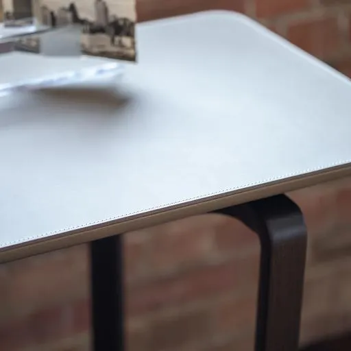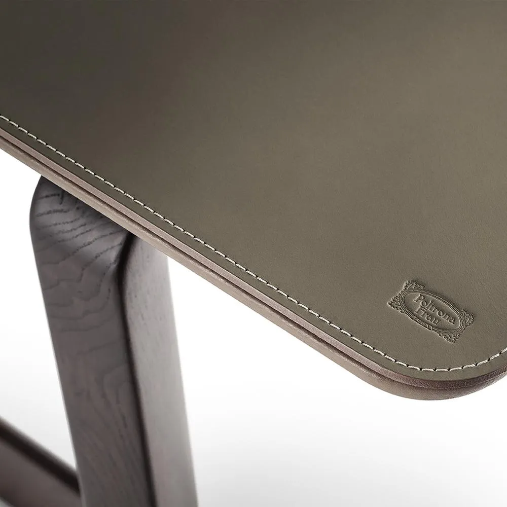 Столешница из мрамора дополнена несущей панелью из МДФ, окрашенной в матово-черный цвет, которая не царапается, а снизу укреплена специальной сеткой, гарантирующей ее прочность. По запросу столешница может быть изготовлена из березовой фанеры и обтянута кожей Saddle Extra. В этом случае нижняя часть выполнена из кожи Pelle Frau® в тон.
