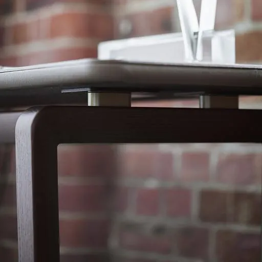 Консольный стол Fidelio с основанием из массива ясеня с морилкой "Мока" или "Венге" поддерживает две двойные стойки с характерным треугольным сечением. Пластины для крепления столешниц изготовлены из стали и окрашены в черный матовый цвет. Распорки из матовой стали с отделкой из натуральной латуни. Самоклеящиеся войлочные накладки защищают пол.