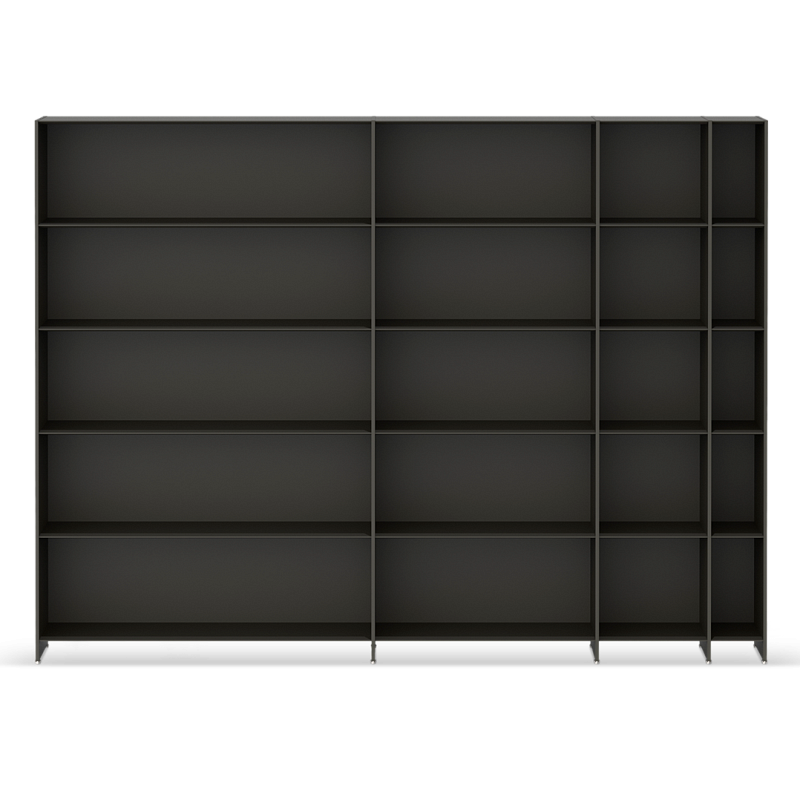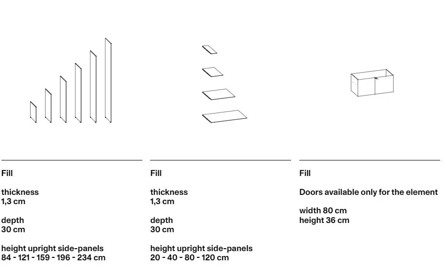 Система книжных шкафов состоит из вертикальных боковых панелей и полок из экструдированного алюминия. Задние панели, изготовленные из листового металла, могут быть свободно установлены на задней стенке книжного шкафа. Боковые панели снабжены регулируемыми ножками. Двери из матового стекла, покрытые лаком с обратной стороны, доступны только для модели element шириной 80 см и высотой 36 см.