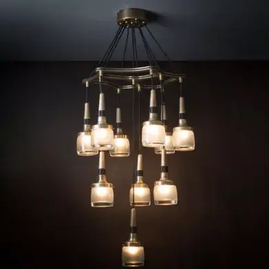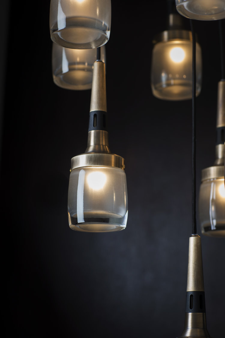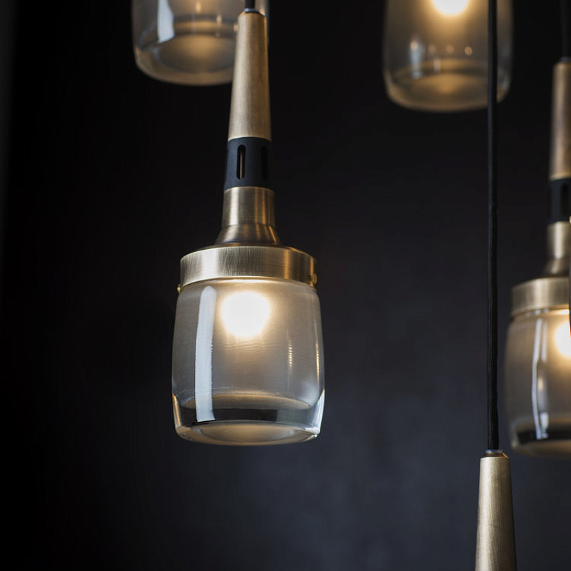 Люстра Flagon с эффектной отделкой из латуни, инкрустирована черными и белыми вставками. Толстые стенки плафонов в виде «виски-бокала» выглядит очень привлекательно. Десять плафонов осветят обеденный стол, прихожую или лестничный проем.