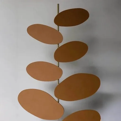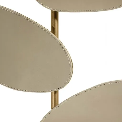 Напольный светильник Foliage состоит из латунного основания, на котором расположено стилизованное «дерево», также выполненное из латуни, с листьями, обтянутыми кожей Pelle Frau®. Инновационная система, разработанная Poltrona Frau, позволяет излучать свет снизу, создавая иллюзию «силуэта» листьев, отражающегося от окружающих стен.