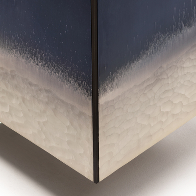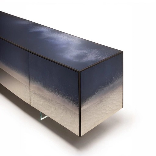 Декор Stromboli из сверхпрозрачного стекла с кислотным травлением, ручной гравировкой и посеребрением на лицевой стороне. Задняя стенка окрашена в синие и серебристые абажуры с насыщенным антикварным эффектом.