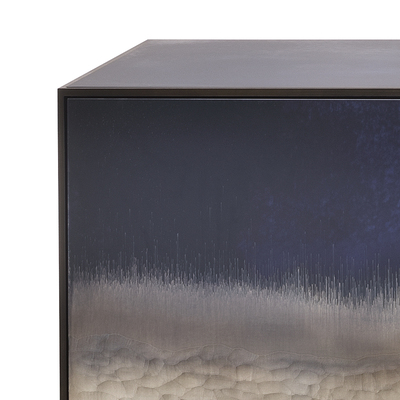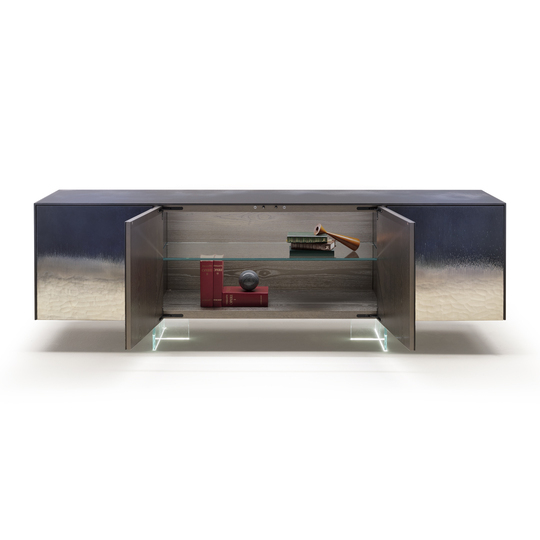 Дверцы, боковины и столешница отделаны отделкой Stromboli. Четыре дверцы, внутри одна полка из сверхпрозрачного стекла со скошенным краем. Внутренняя светодиодная подсветка с датчиком открытия.Ножки из сверхпрозрачного закаленного стекла со светодиодной подсветкой.