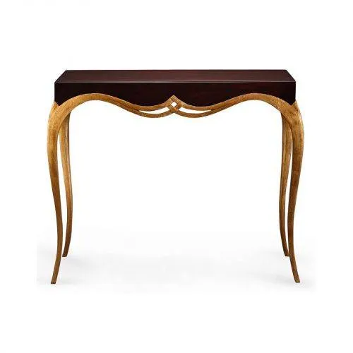 Привлекательная консоль из массива и шпонированного красного дерева с изящными ножками-саблями и красивой декоративной отделкой в виде ромбовидных замочных скважин.