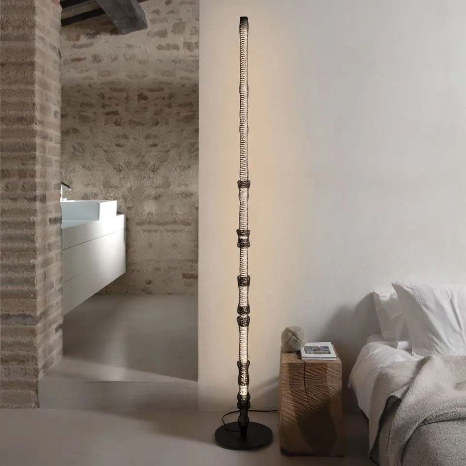 Торшер от итальянской фабрики Karman можно использовать в нескольких вариантах, с металлической сеточкой-кольчугой, с дятлом, который спускается сверху вниз по нему или просто без всего.