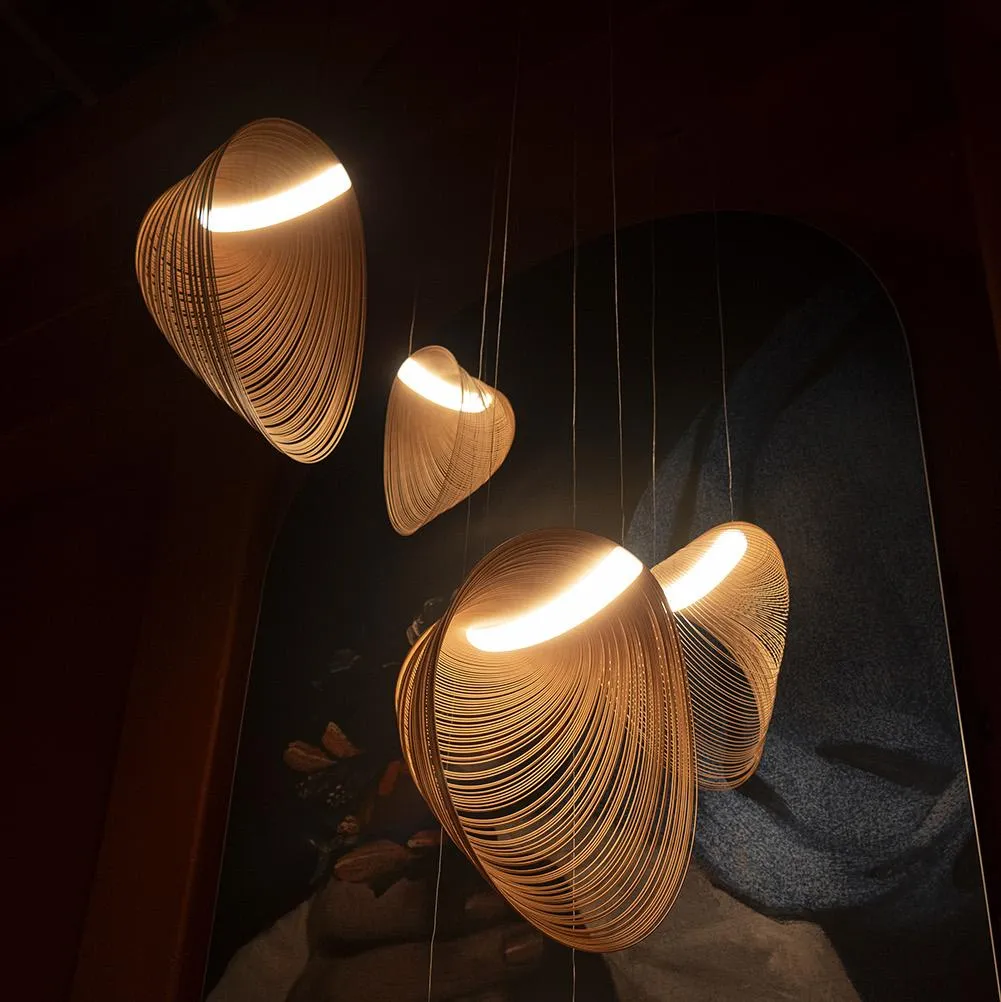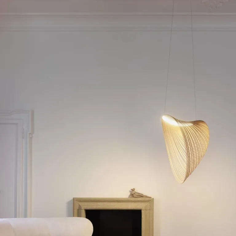 Подвесной светильник Illan от Luceplan имеет неземной, яркий дизайн, подчиняющийся волнообразному движению воздуха, постоянному изменению, которое задает форму и формирует световой объем. Он состоит из очень легкого корпуса, изготовленного из тонкой, гибкой фанеры, вырезанной лазером по плотно уложенным равноудаленным линиям и подвешенной к потолку.