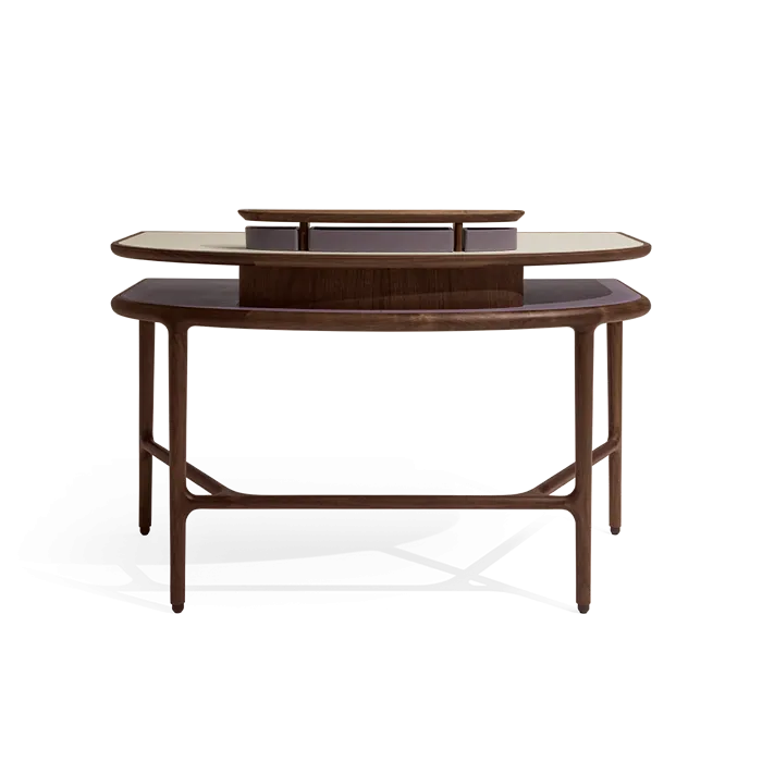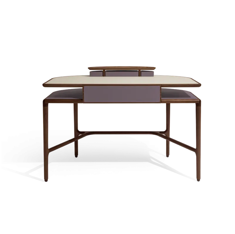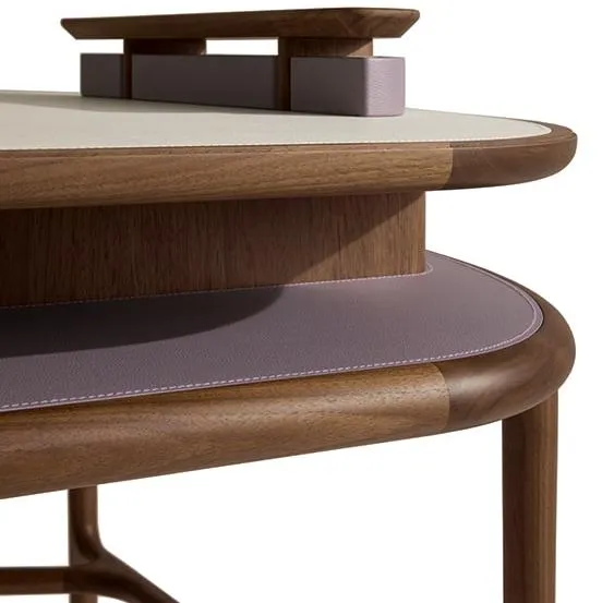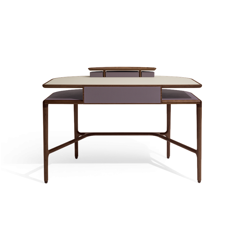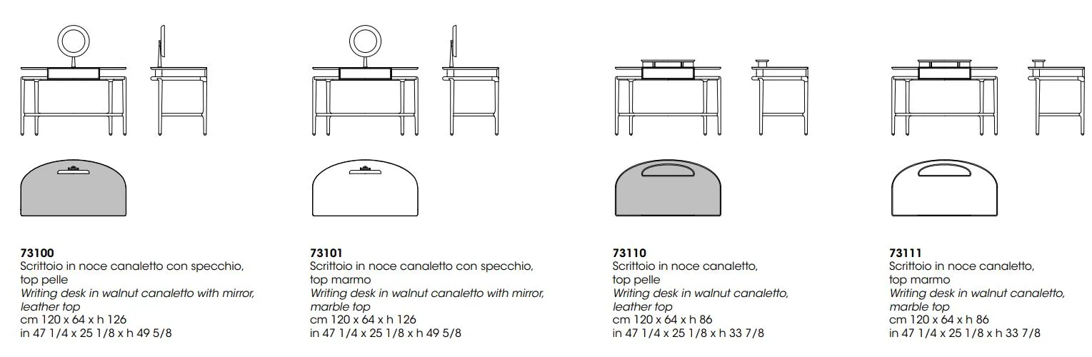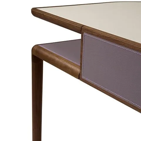 Письменный стол выполнен из массива орехового дерева canaletto. Нижняя часть столешницы и передняя часть выдвижного ящика обтянуты кожей. Верхняя часть может быть выполнена из кожи или мрамора Calacatta, Portoro или Zebrino.