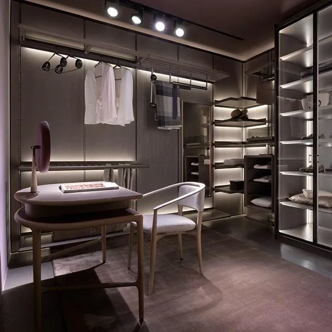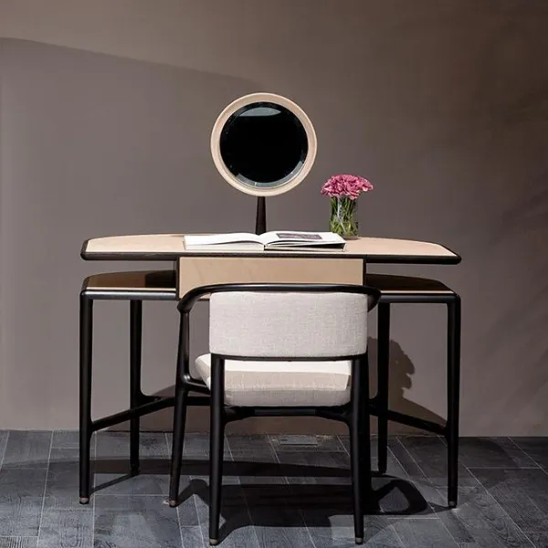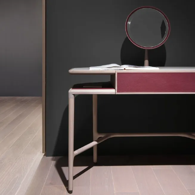 Доступен в двух вариантах исполнения: с верхней секцией для хранения или с регулируемым круглым зеркалом, оба они обтянуты кожей двух разных цветов.