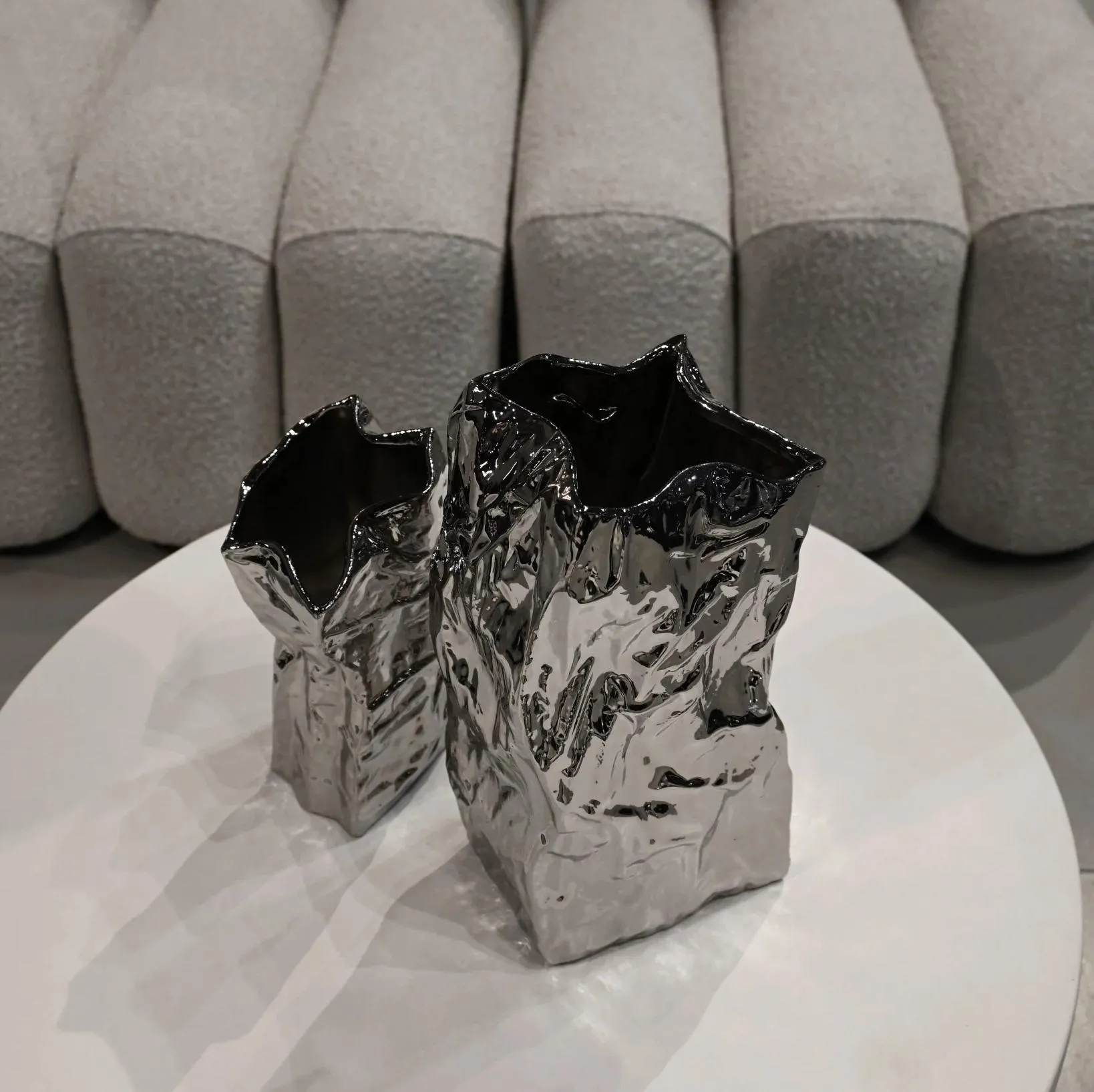 Дизайн Kami Vase , вдохновленный бумажными пакетами, подчеркивает эстетику хрустящих и рассыпающихся бумажных пакетов.