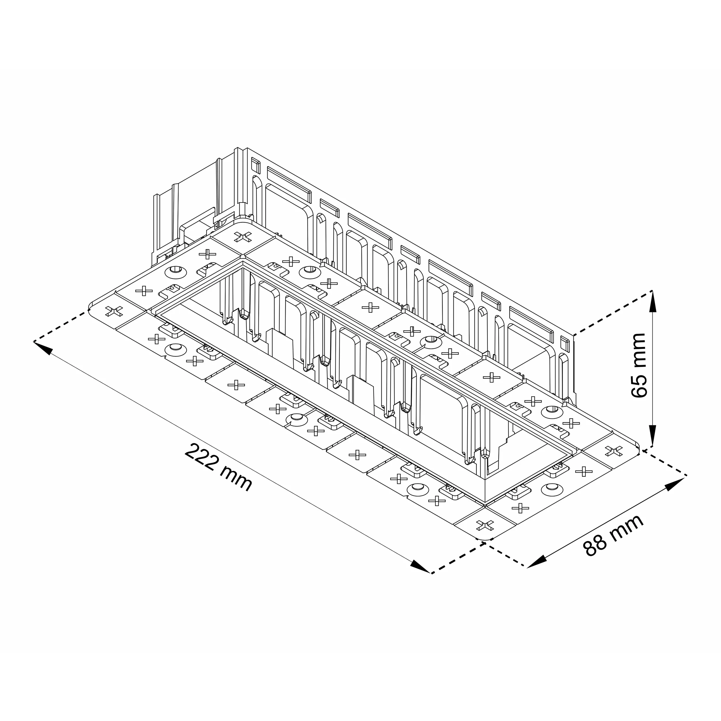 Каркас встраиваемый безрамочный на 4 модульных светильника, белый, монтажное отверстие (прямоугольное) 198х65 мм, общий размер 222х88 мм, размер видимой части 182х48 мм, высота 65 мм