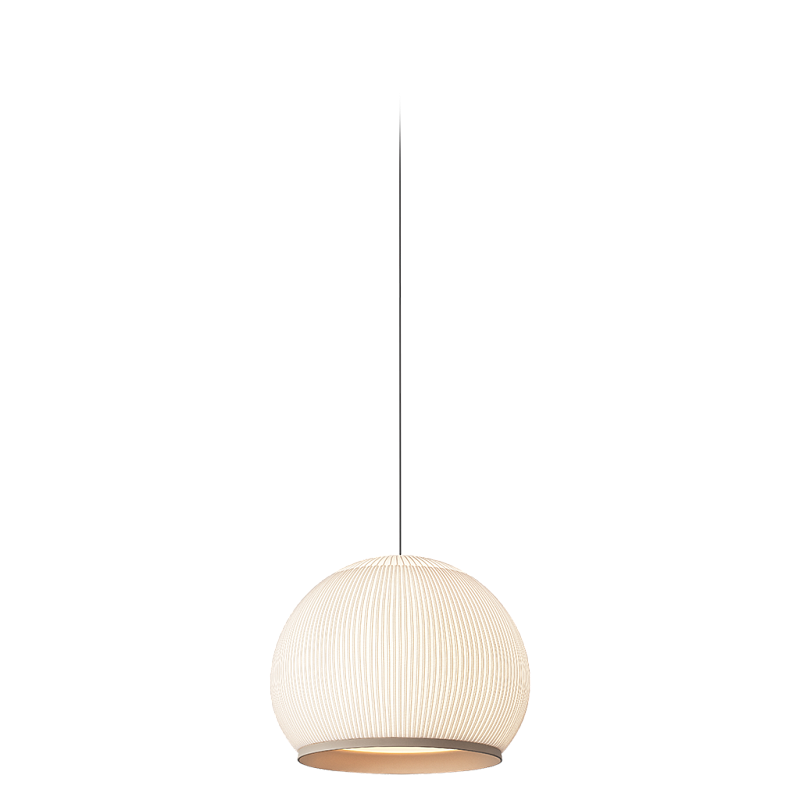 Плафон покрыт эластичной лайкрой, которая вяжется в виде ребер в технике плакирования. Более темные ребра матовые и осязаемые, а пространство между ребрами выполнено из тонкой вязки, которая создает рассеянное свечение на 360 градусов. Свет проникает сквозь ткань наружу и сквозь полупрозрачную сетку, смягчая ее яркость.