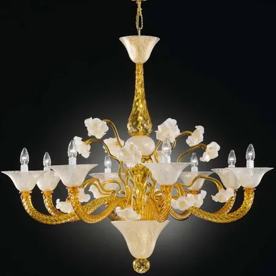 Верхняя и нижняя чаши, розетки на рожках и декор в виде цветов - муранское стекло золотистого цвета с эффектом "инея".