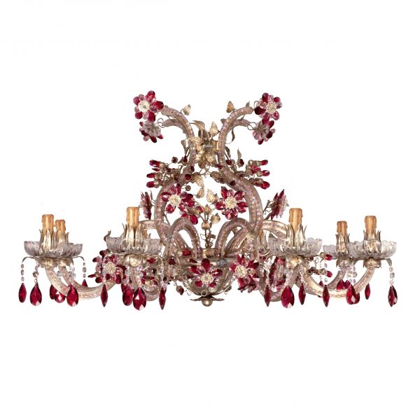Люстра из кованого железа серебряного цвета с прозрачным богемским хрусталем, муранским стеклом и перламутровой окантовкой.