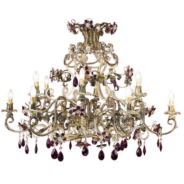 Люстра из кованого железа серебряного цвета с прозрачным богемским хрусталем, муранским стеклом и перламутровой окантовкой.