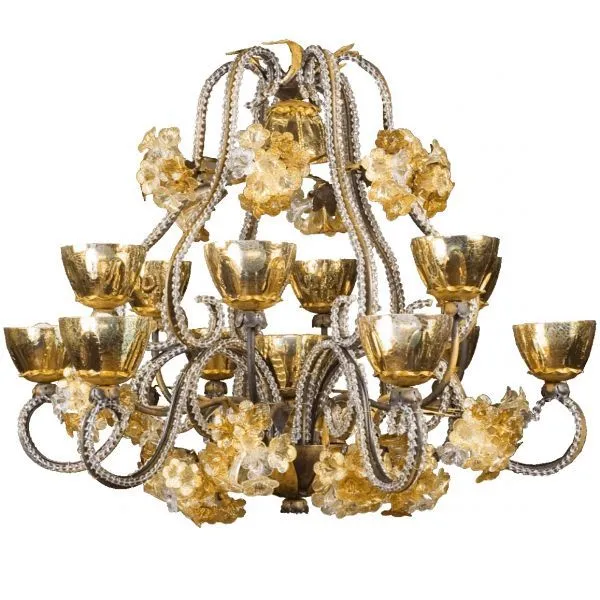 Люстра на 14 ламп из кованого железа золотого и ржавого цветов. Украшена богемским хрусталем, муранским стеклом и прозрачной жемчужной окантовкой.