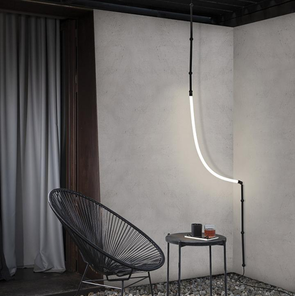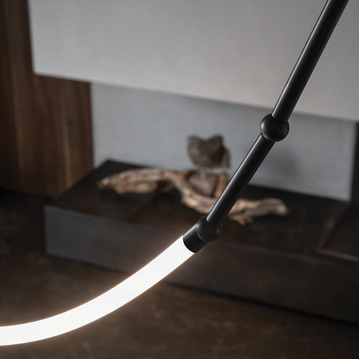 Светильники в этой коллекции представляют собой цилиндрические стержни и небольшие сферы из анодированной бронзы или черного алюминия, расположенные подобно жемчужинам в кольце на проволоке, поддерживающей светодиоды, заключенные в прозрачную гибкую силиконовую трубку.
