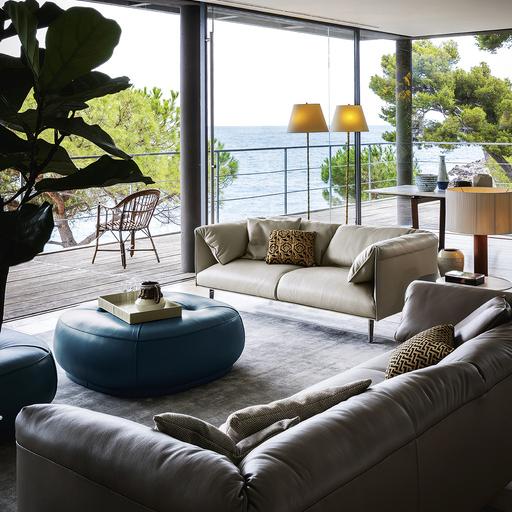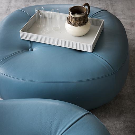 Пуфы Leplì могут быть обиты кожей Pelle Frau® или тканью с декоративной кожаной окантовкой. Если обивка выполнена из кожи, декоративная окантовка всегда того же цвета, что и у пуфа. В кожаном варианте четыре складки начинаются от центральной кнопки сиденья и образуют профиль пуфа. В тканевом варианте складки заменены строчкой.