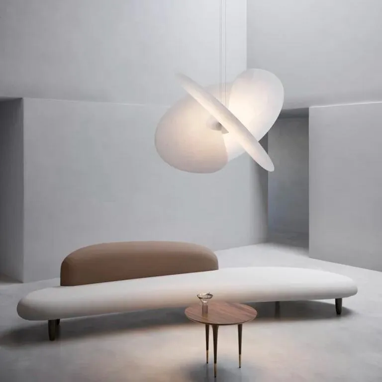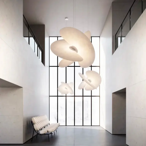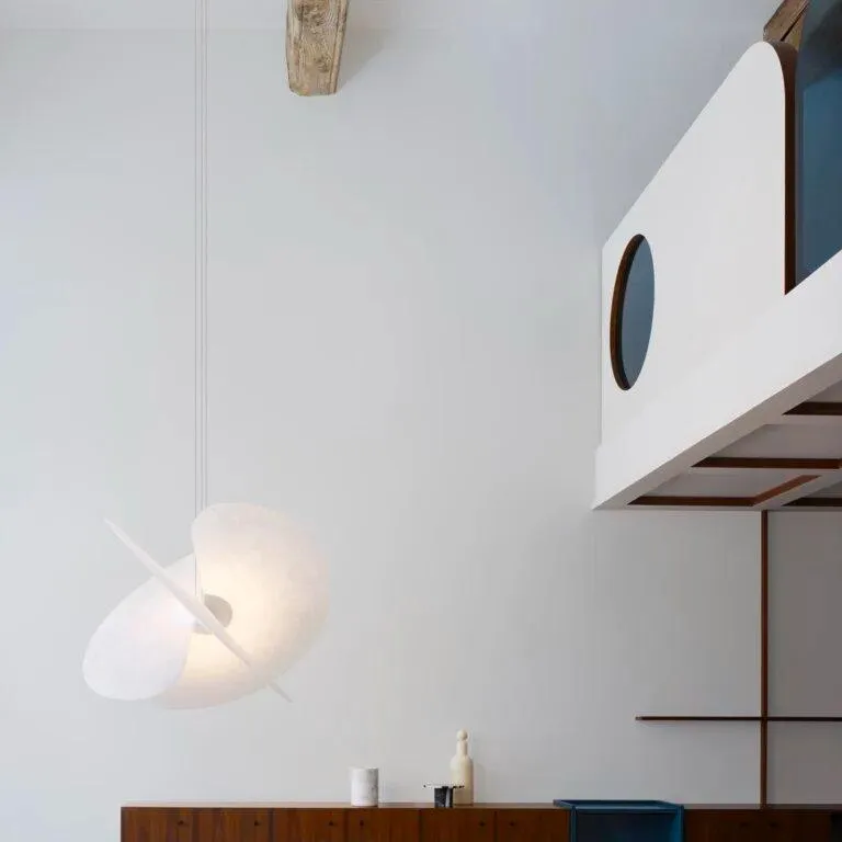 Levante - это эффектная люстра. Она представляет собой переплетение трех больших вентиляторов, выполненных из необычного для сферы дизайна материала – он используется в пищевой промышленности, выглядит как рисовая бумага и способен равномерно рассеивать свет по всему помещению. Вентиляторы очень тонкие и прикреплены магнитом к центральной секции, в которой находится лампочка, спрятанная как настоящее бьющееся сердце.