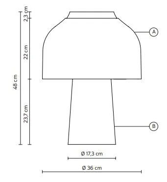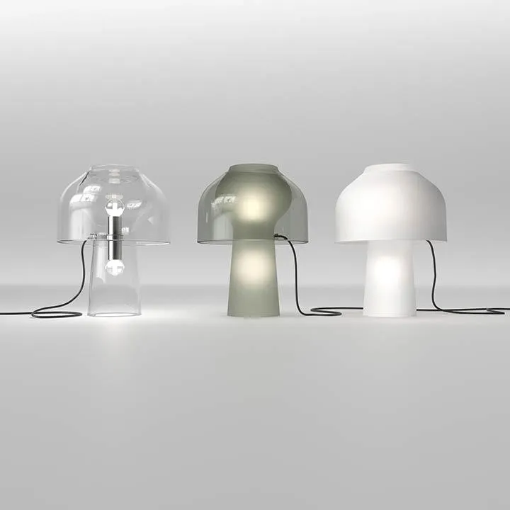 Прозрачная вуаль из выдувного стекла, выполненная таким образом, чтобы подчеркнуть двойное расположение светильников внутри основания и абажура. Она создает общий вид матового белого стекла, из-за которого трудно отличить основание от абажура. Корпус лампы из дымчатого стекла. Рассеиватель из прозрачного стекла для рассеивателя