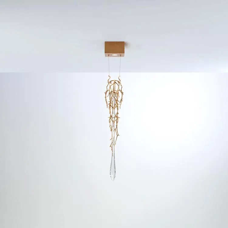Чистая и ослепительная, коллекция Liquid намеренно представлена в "плотном" дизайне. Обширный разветвленный узор окружает стеклянное изделие внушительных размеров, словно в объятиях природы, где движение структуры стремится достичь падения капли воды. Благодаря использованию стальных тросов коллекция Liquid идеально подходит для ситуаций, требующих определенной структуры и великолепия, придавая ей статус световой скульптуры. Идеально подходит для современных интерьеров, идеально обрамляя вертикальную витрину.