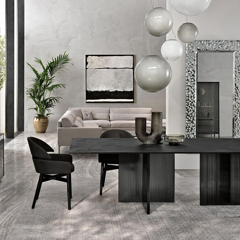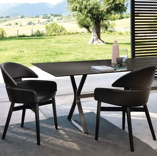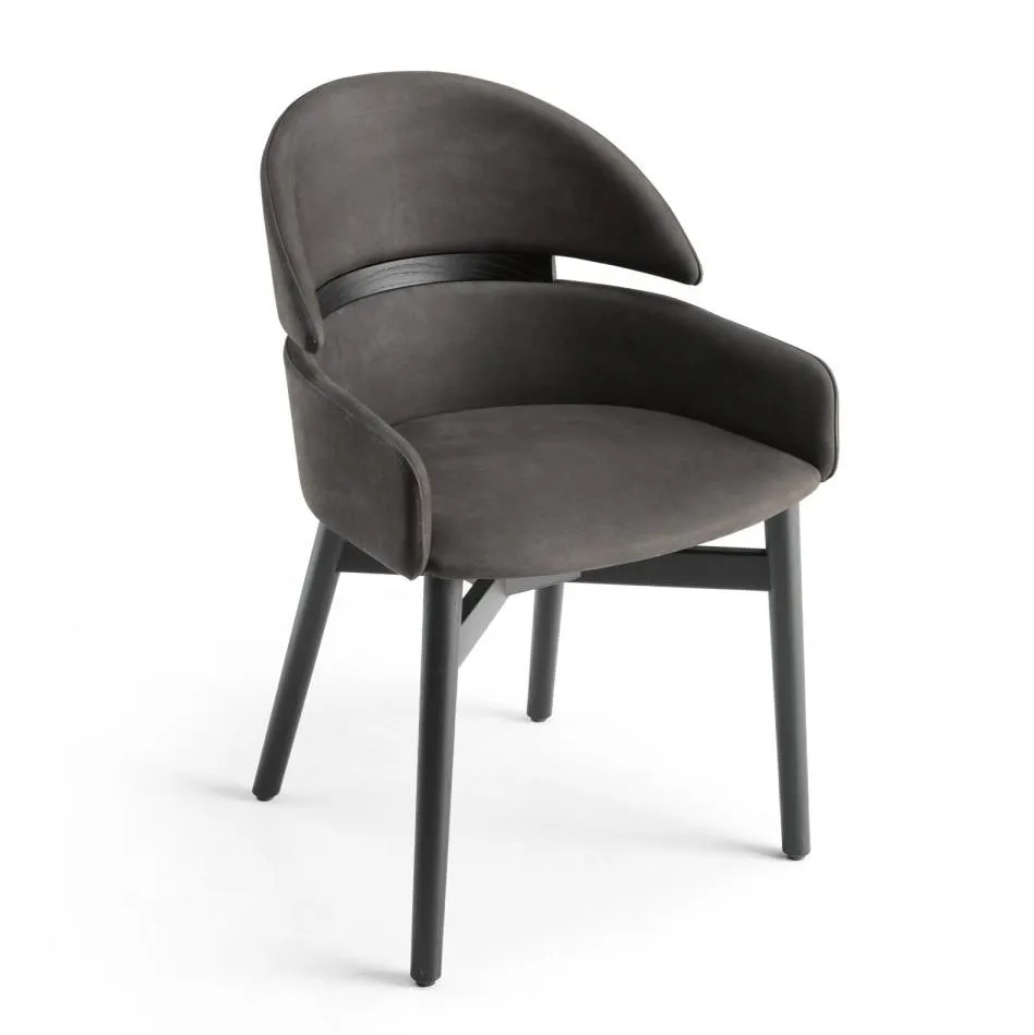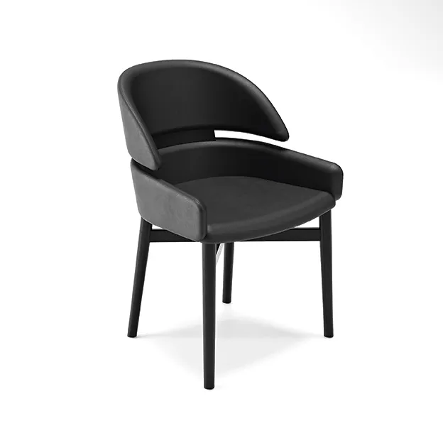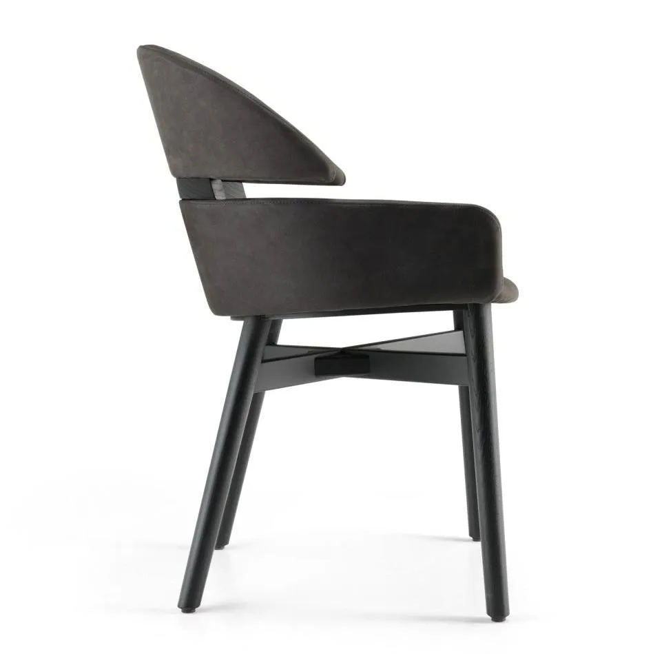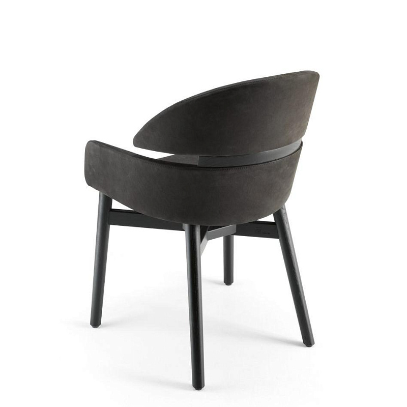 Кресло из массива дерева, имеющее табачную отделку из дуба или покрытое черным лаком с открытыми порами. Сиденье и спинка обиты кожей или нубуком.