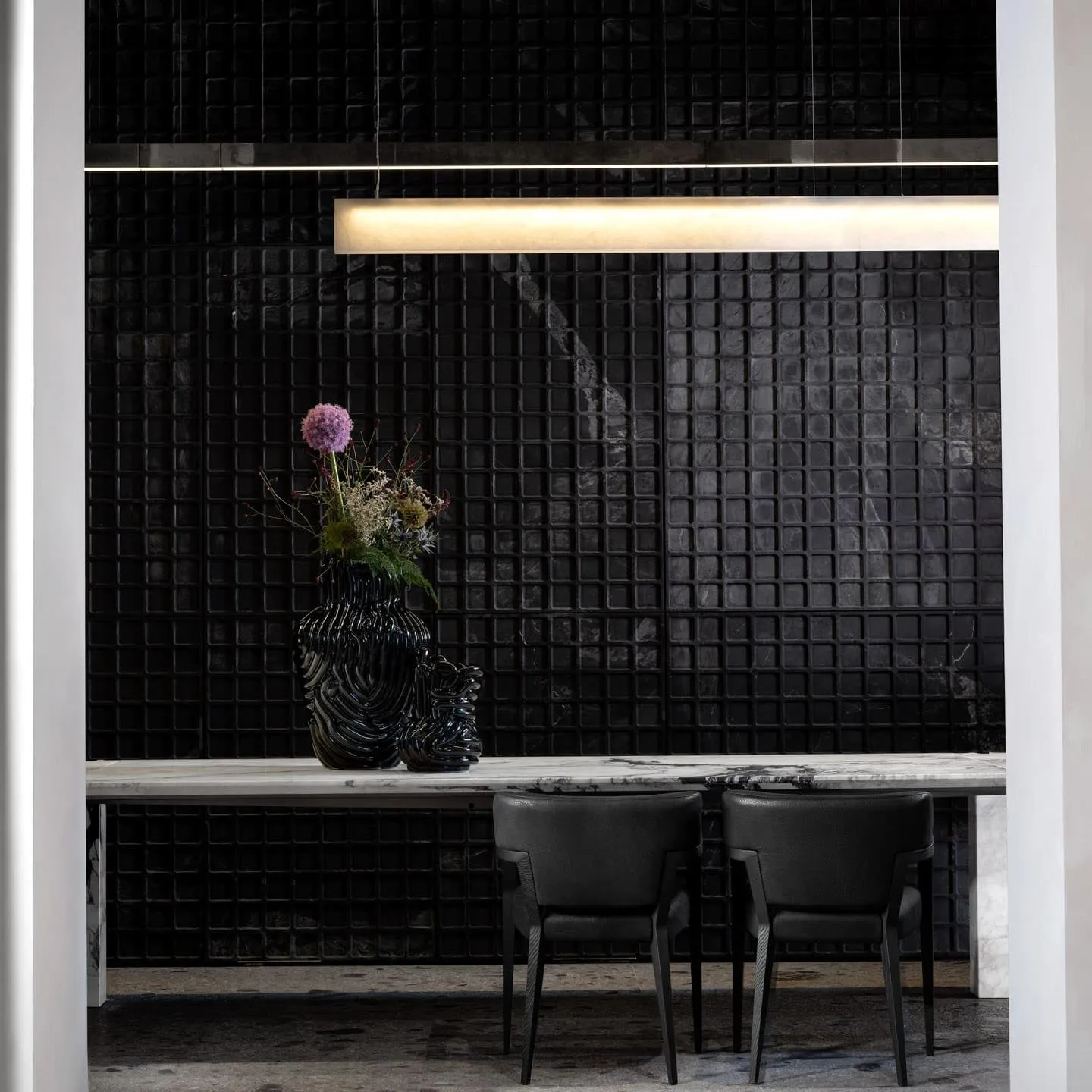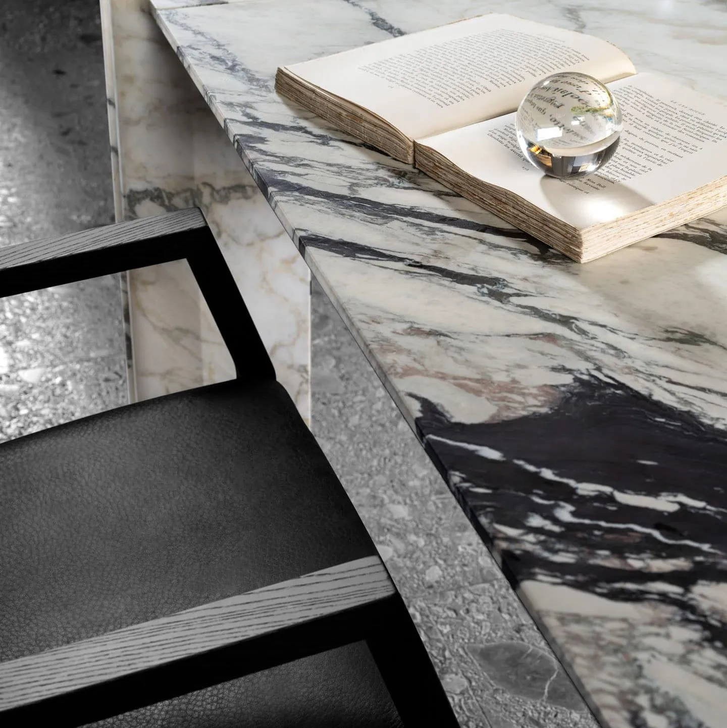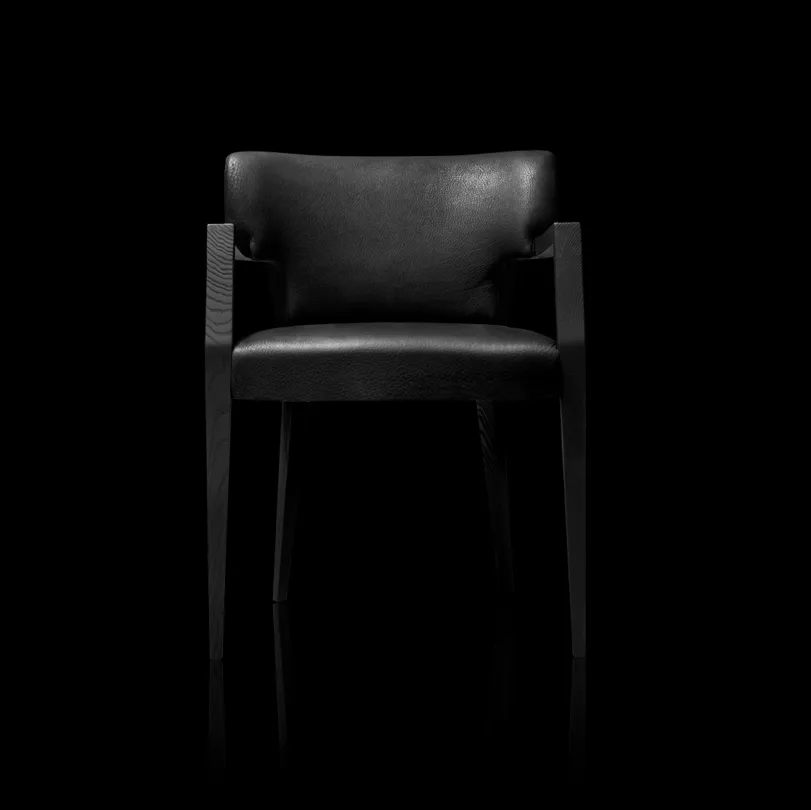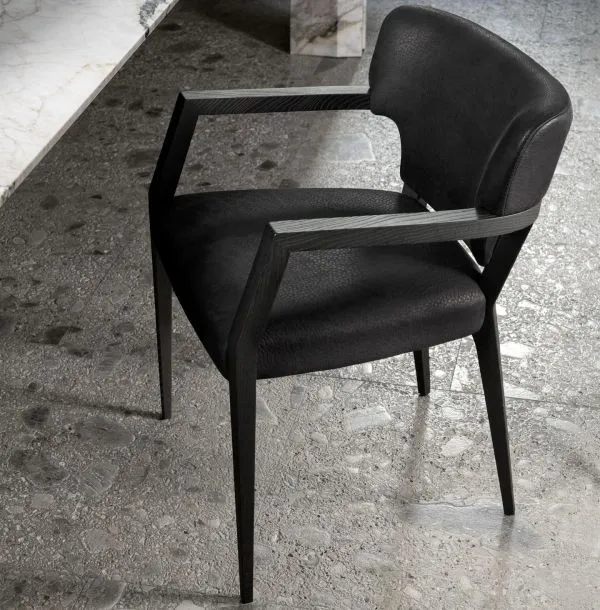 Удлиненные, заостренные ножки из черного лакированного дерева, разделенные на подлокотники, привлекают внимание, придавая выразительную силу позе, подчеркивая выразительную телесность острого силуэта, балансирующего между формальной строгостью и удобством.