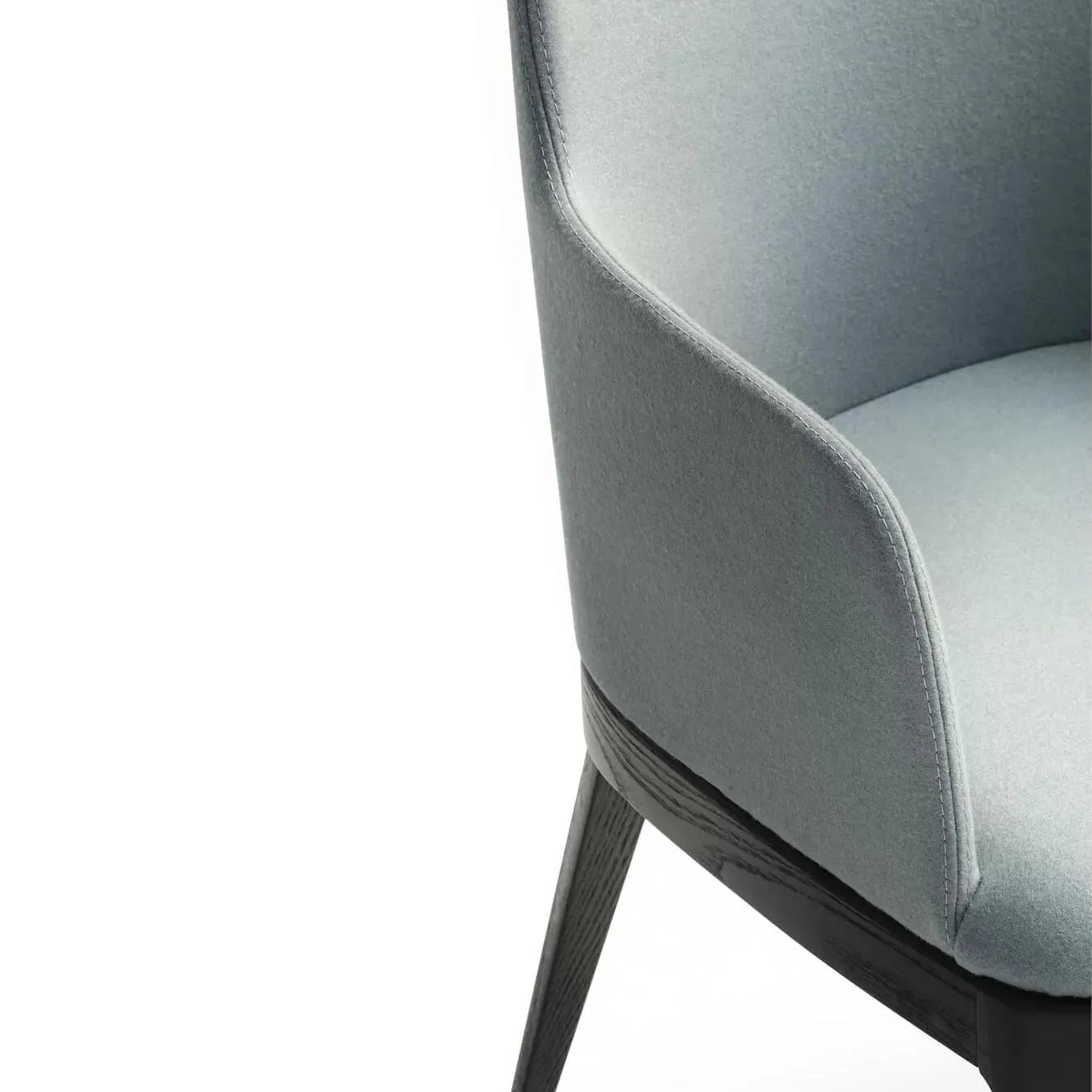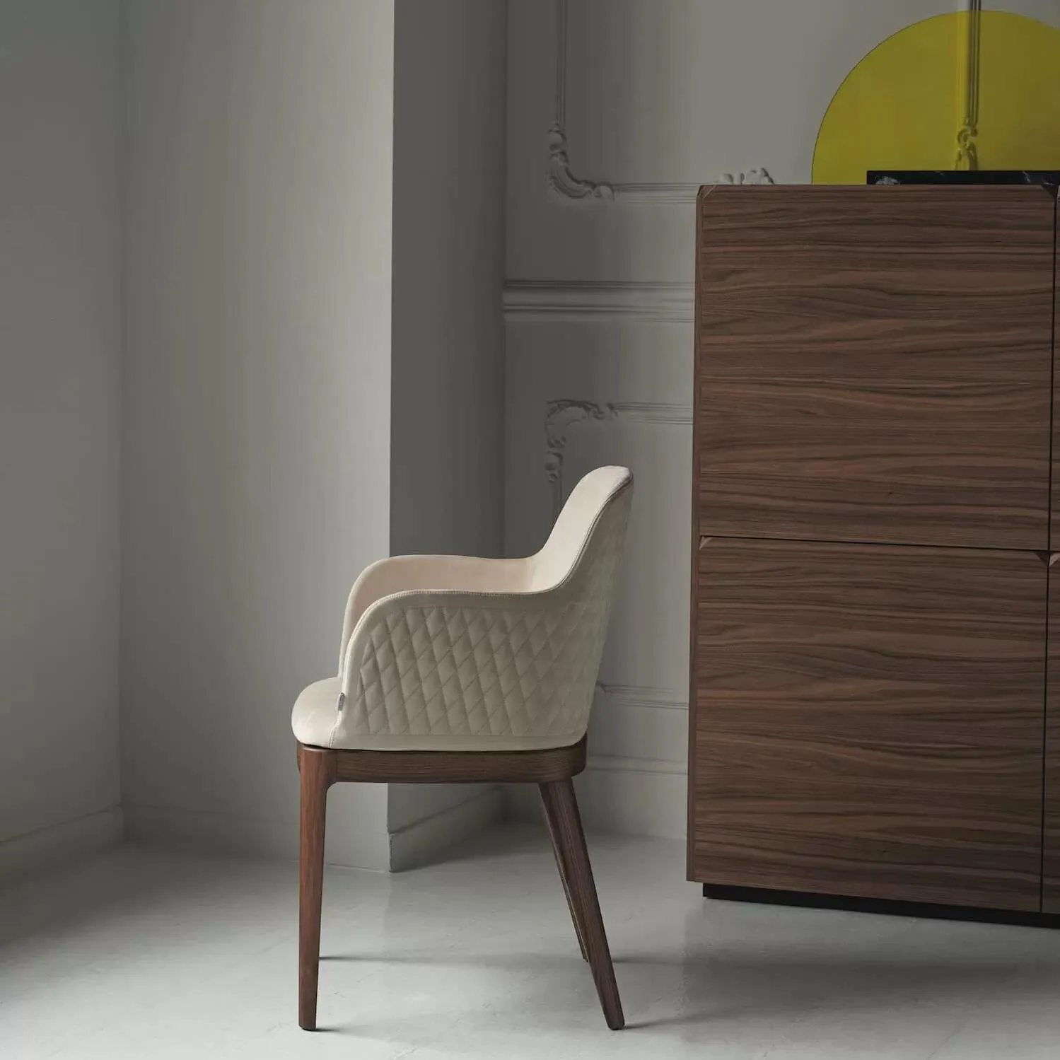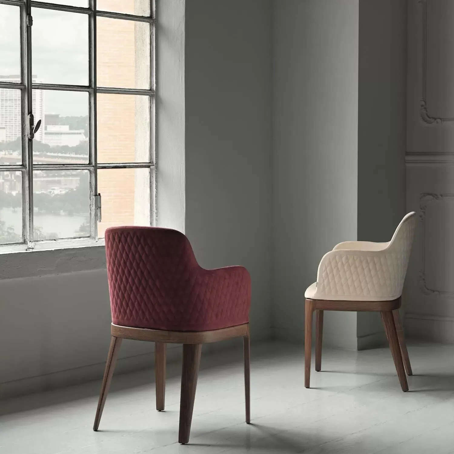 Стул с подлокотником на каркасе из массива дерева или металла, покрытого лаком. Обивка кресла выполнена из экокожи премиум-класса, ткани Bouquet, ткани для гурманов, скандинавской ткани, натуральной шерсти, бархата высшего качества и кожи Наппа премиум-класса. Также доступна версия со стеганой спинкой (только для ткани Nordic и высококачественной кожи nappa).