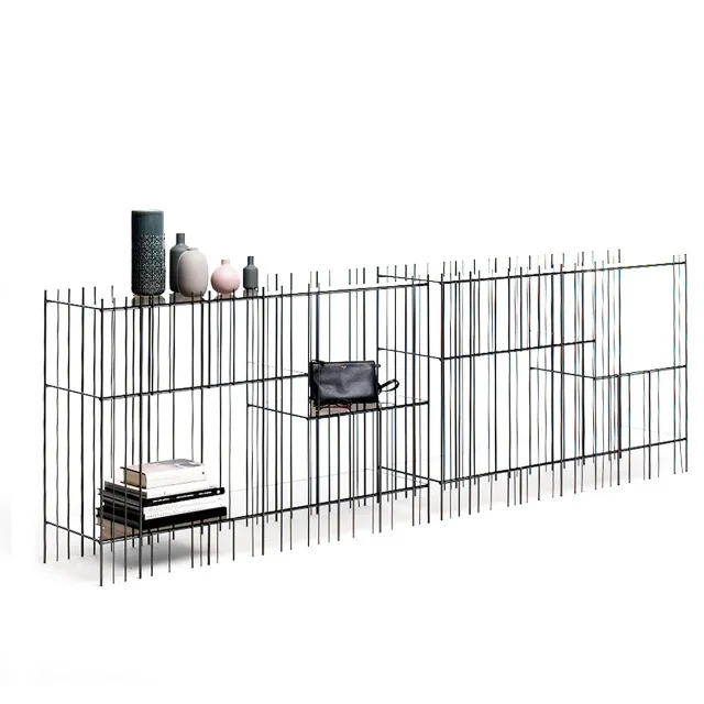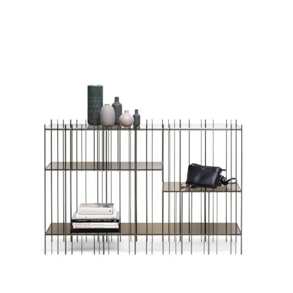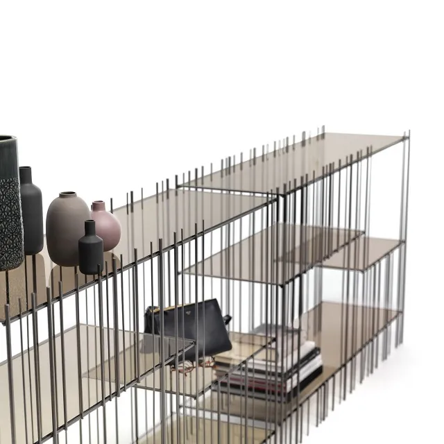 Metrica - это металлическая консоль, имеющая титановую, полированную, золотую отделку, с прозрачными хрустальными полками бронзового или зеленого цвета. Структура проста, ритм задан железными прутьями, закрепленными через разные промежутки на откровенно строгой конструкции, внутри которой книги и предметы дополняют форму, время от времени создавая новые композиции.
