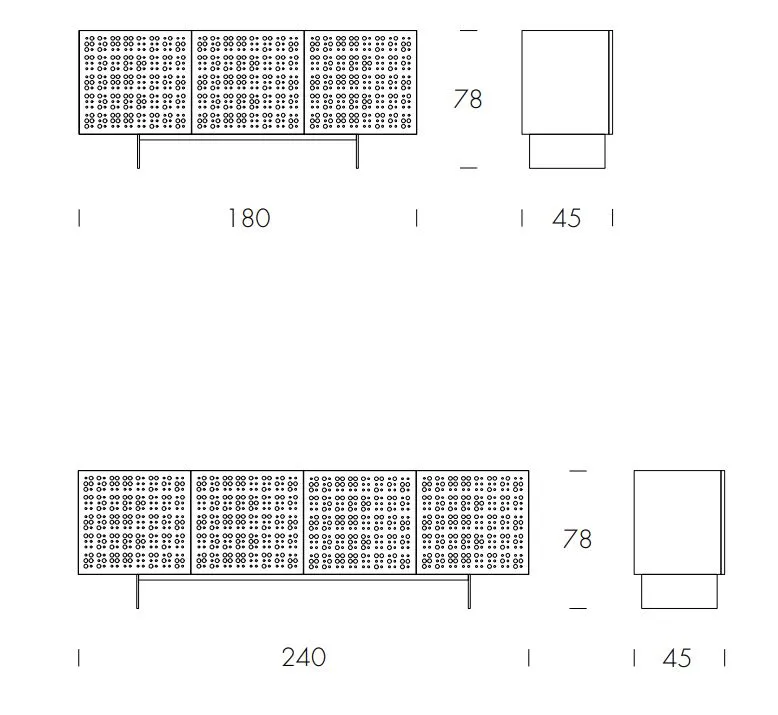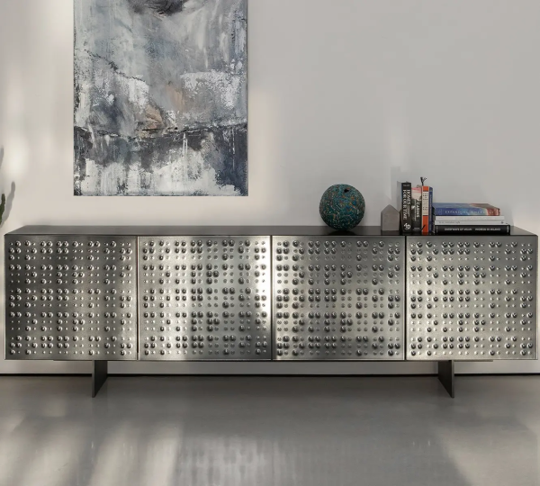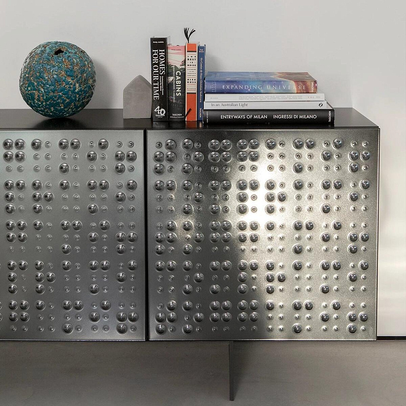 Комод с 3-мя или 4-мя дверцами, выполненными из хрустальной бронзы или с дымчатой отделкой, с деревянной лакированной конструкцией, отполированной черным лаком, и окрашенным металлическим основанием. Millebolle отличается ярко выраженным индивидуальным дизайном, который подчеркивается контрастом между матовой сатиновой отделкой дверей и потоком блестящих хрустальных пузырьков. Эта восхитительная игра света и тени придает определенную смелость любому помещению.