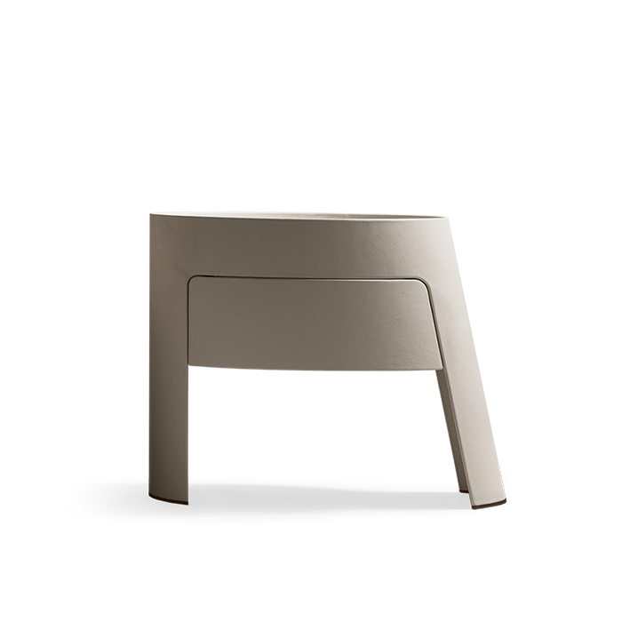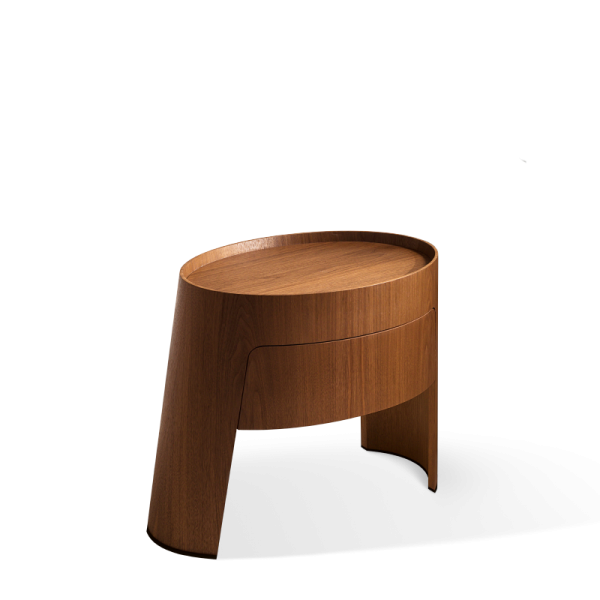 Прикроватный столик с полностью выдвижным ящиком. Конструкция выполнена из гнутой фанеры тополя с отделкой из орехового шпона каналетто или полностью обтянута кожей.