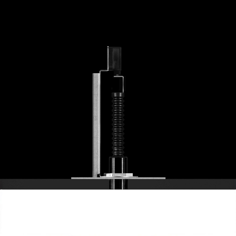 Видимая часть светильника — крошечная «черная дыра», аккуратно нарисованная на потолке. За ней скрывается мощный LED источник и инновационная линза, создающие чистое, направленное освещение.