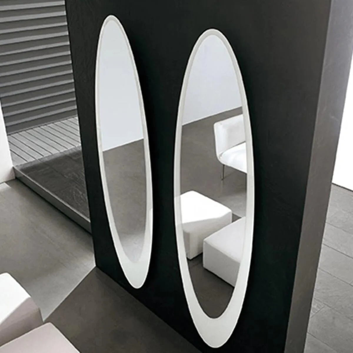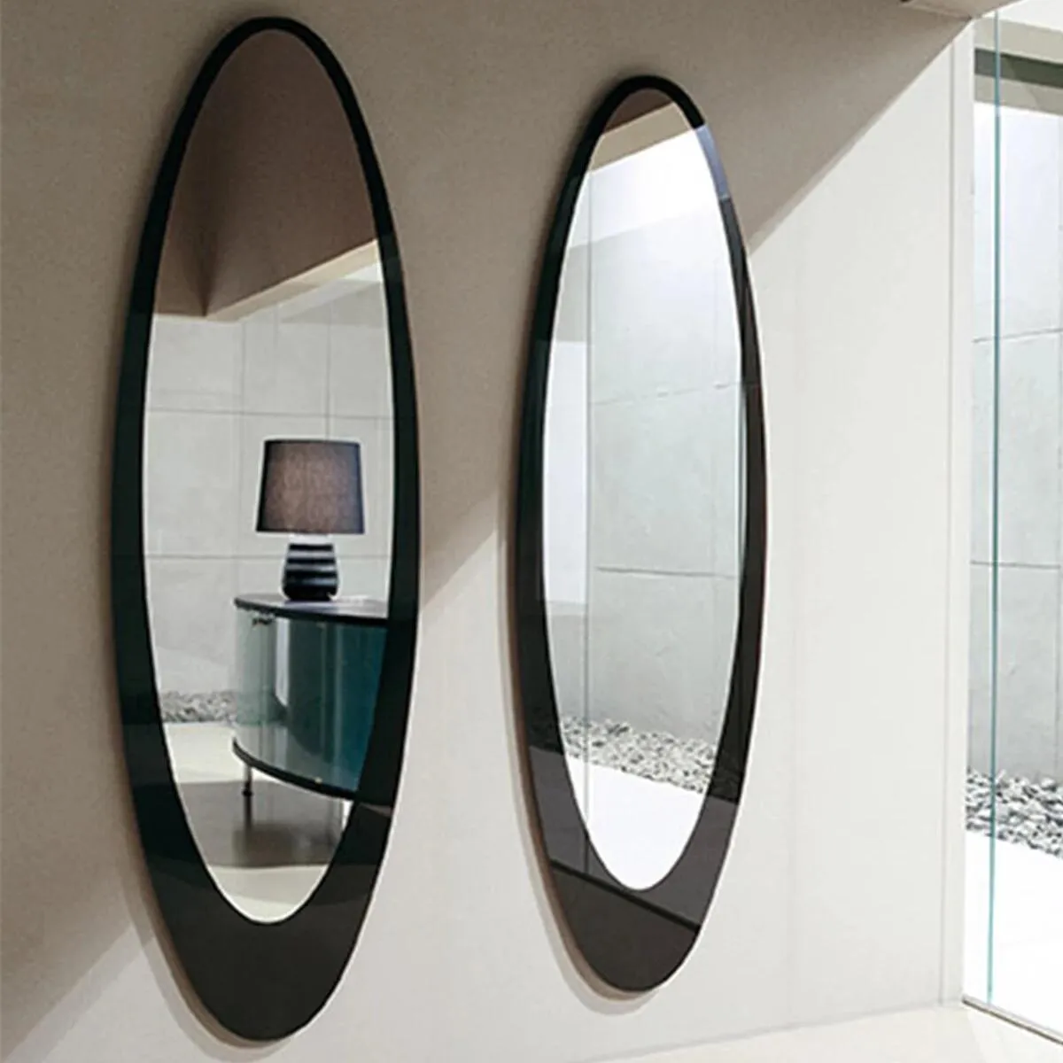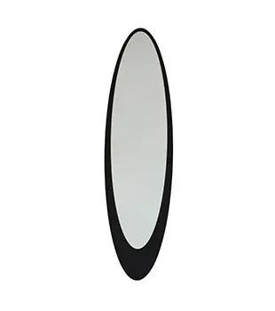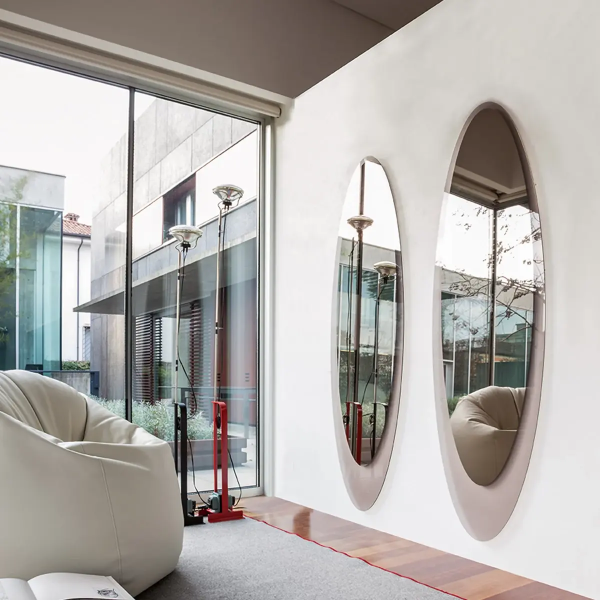 Зеркало Olmi напоминает пару слегка расширяющихся книзу эллипсов, которые выходят друг из друга. Первое основание, покрытое шелкографией или бронзой в различных вариантах отделки, оставляет внутри место для настоящего зеркала, также покрытого бронзой или серебром.