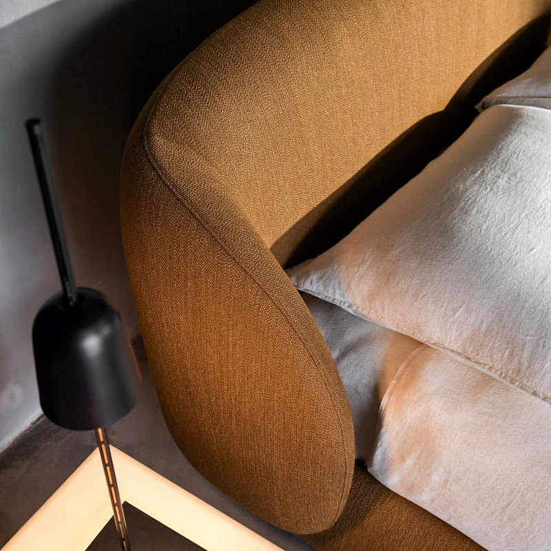 Изголовье скульптурной кровати, отличающейся мягкими формами, подобно стремительной волне, плавно изгибается.