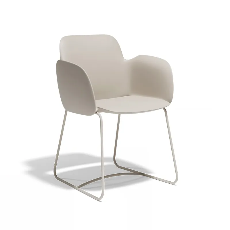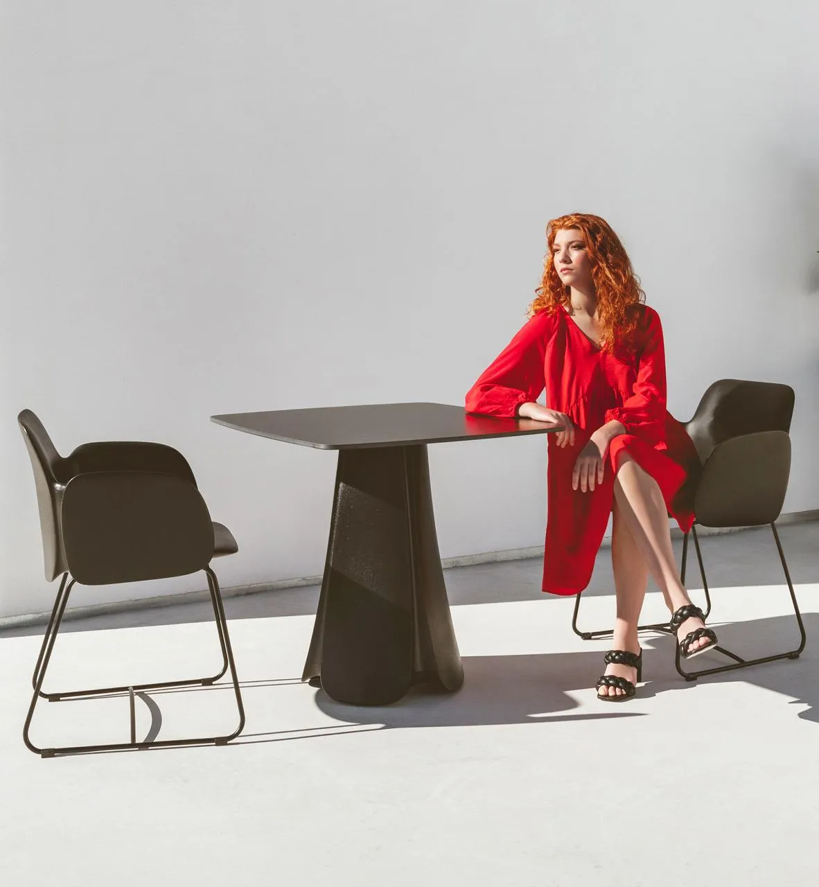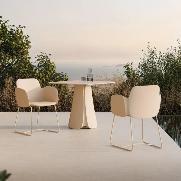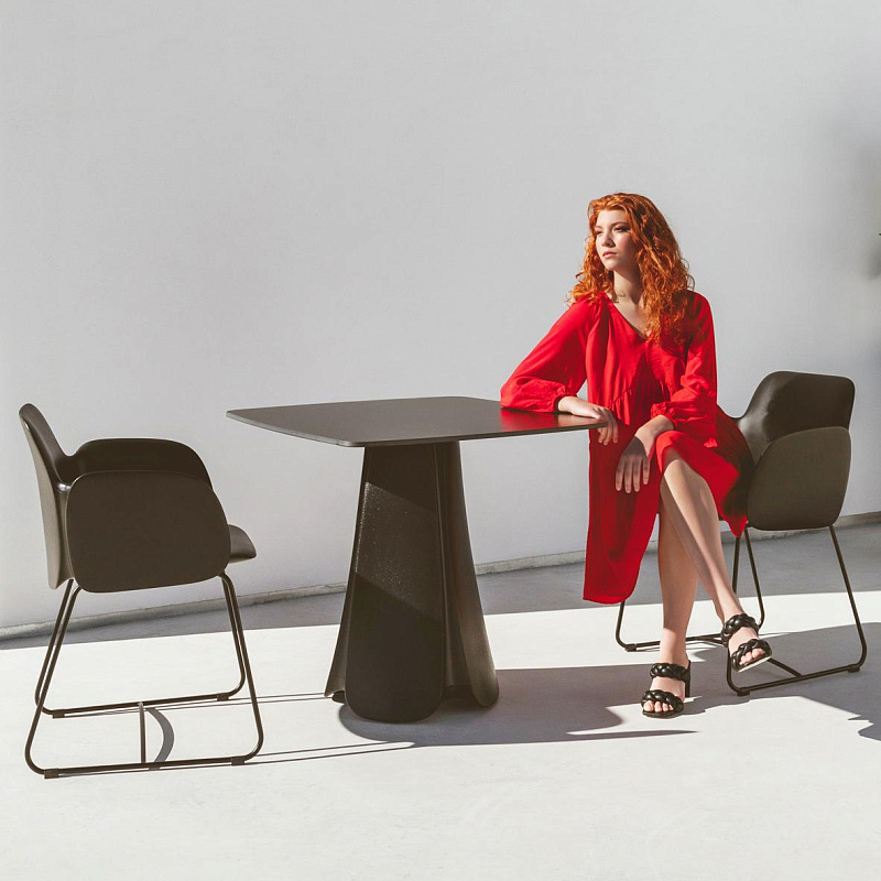 Кресло изготовлено из полиэтиленовой смолы методом ротационного формования. Ножки изготовлены из нержавеющей стали с покрытием power, цвет которого соответствует цвету сиденья. Изделие подходит для использования внутри и снаружи помещений. Доступны различные варианты отделки.