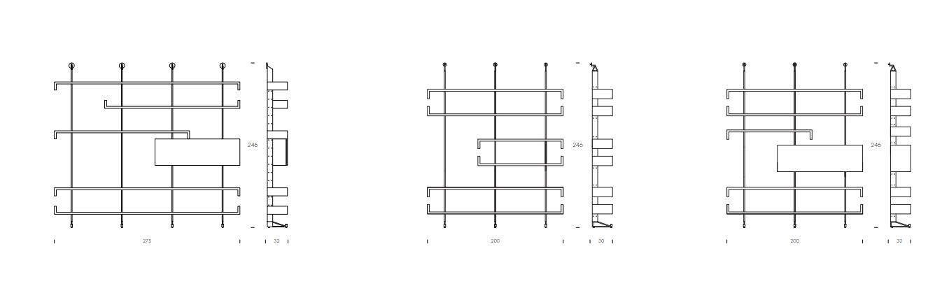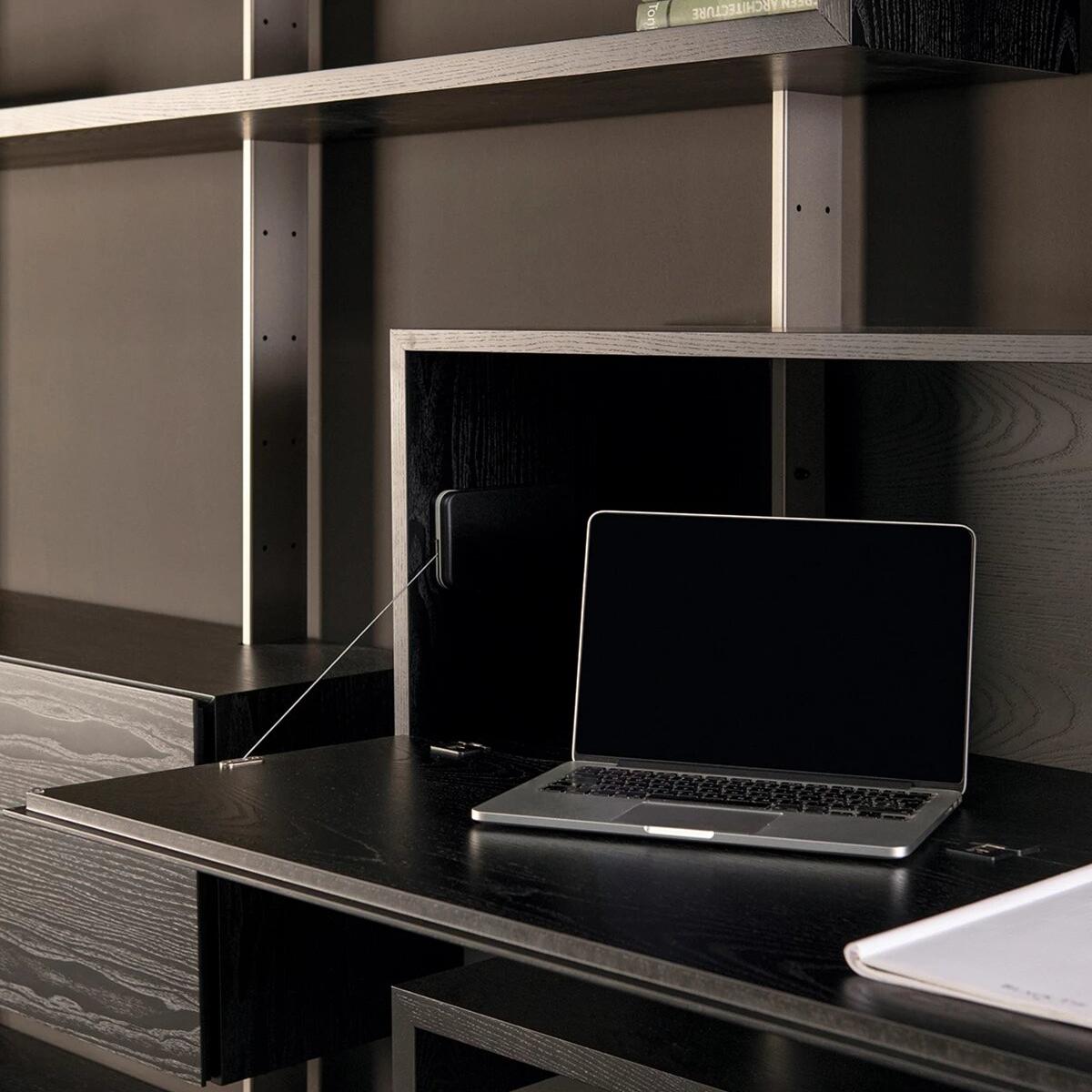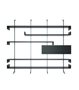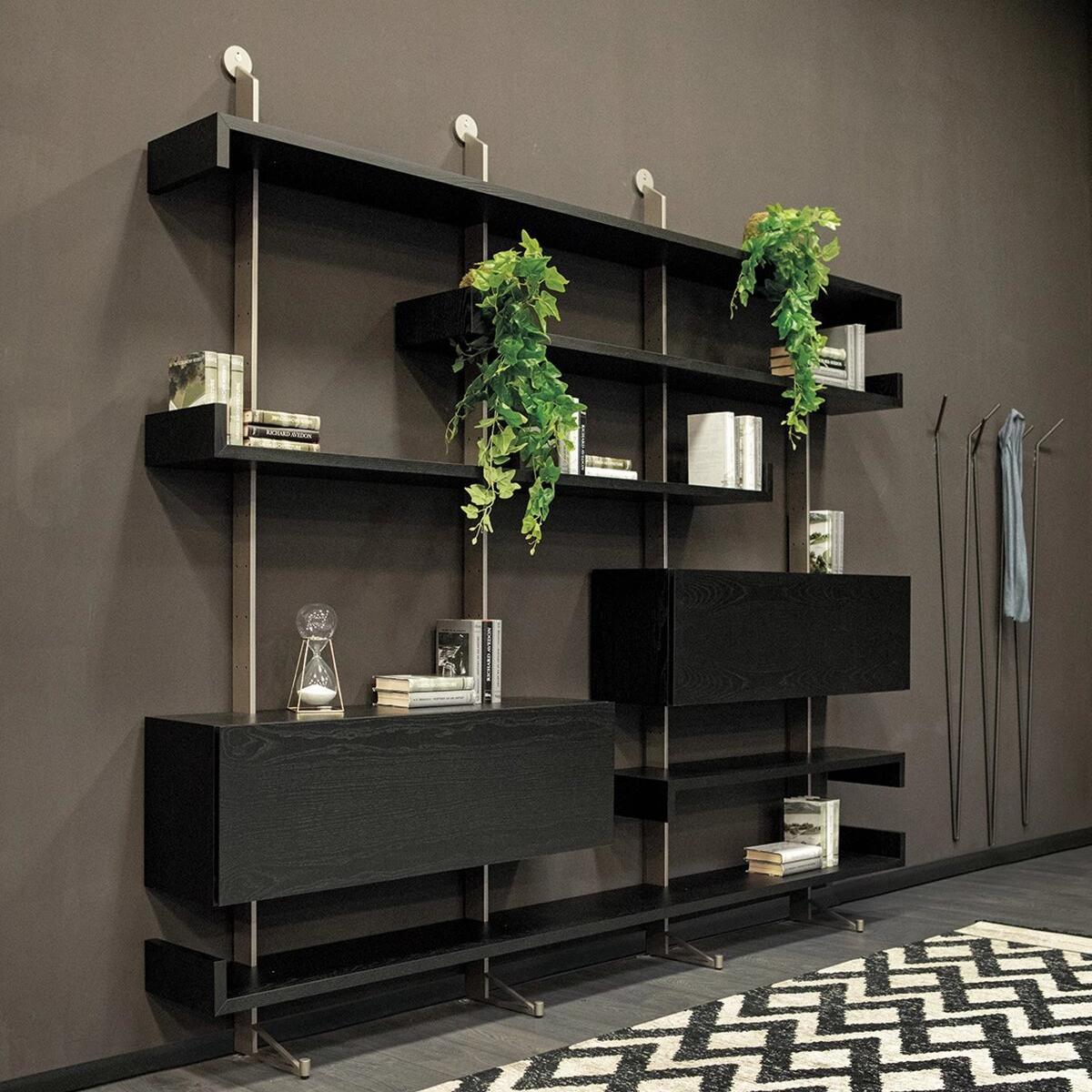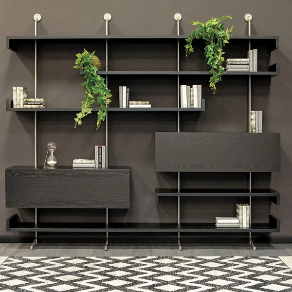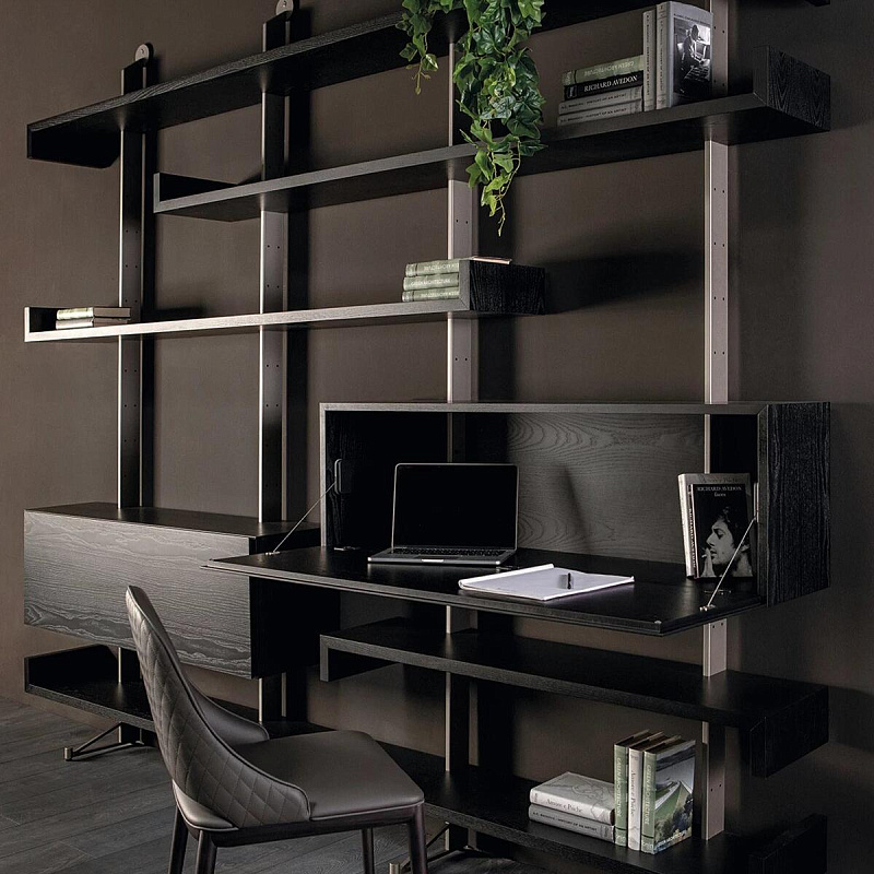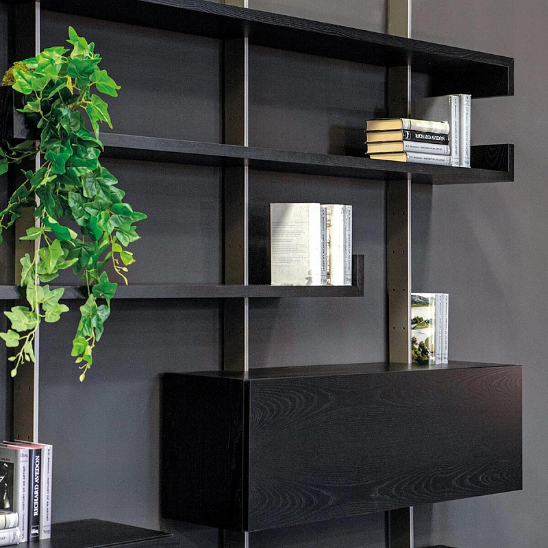 Этот книжный шкаф состоит из ряда полок, которые создают движение, нарушая целостность стены. В дополнение к полкам можно установить выдвижные ящики различных размеров, чтобы увеличить пространство для хранения в