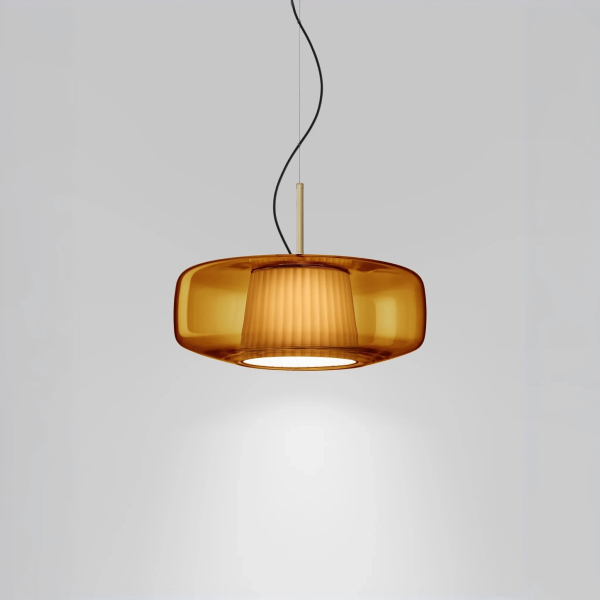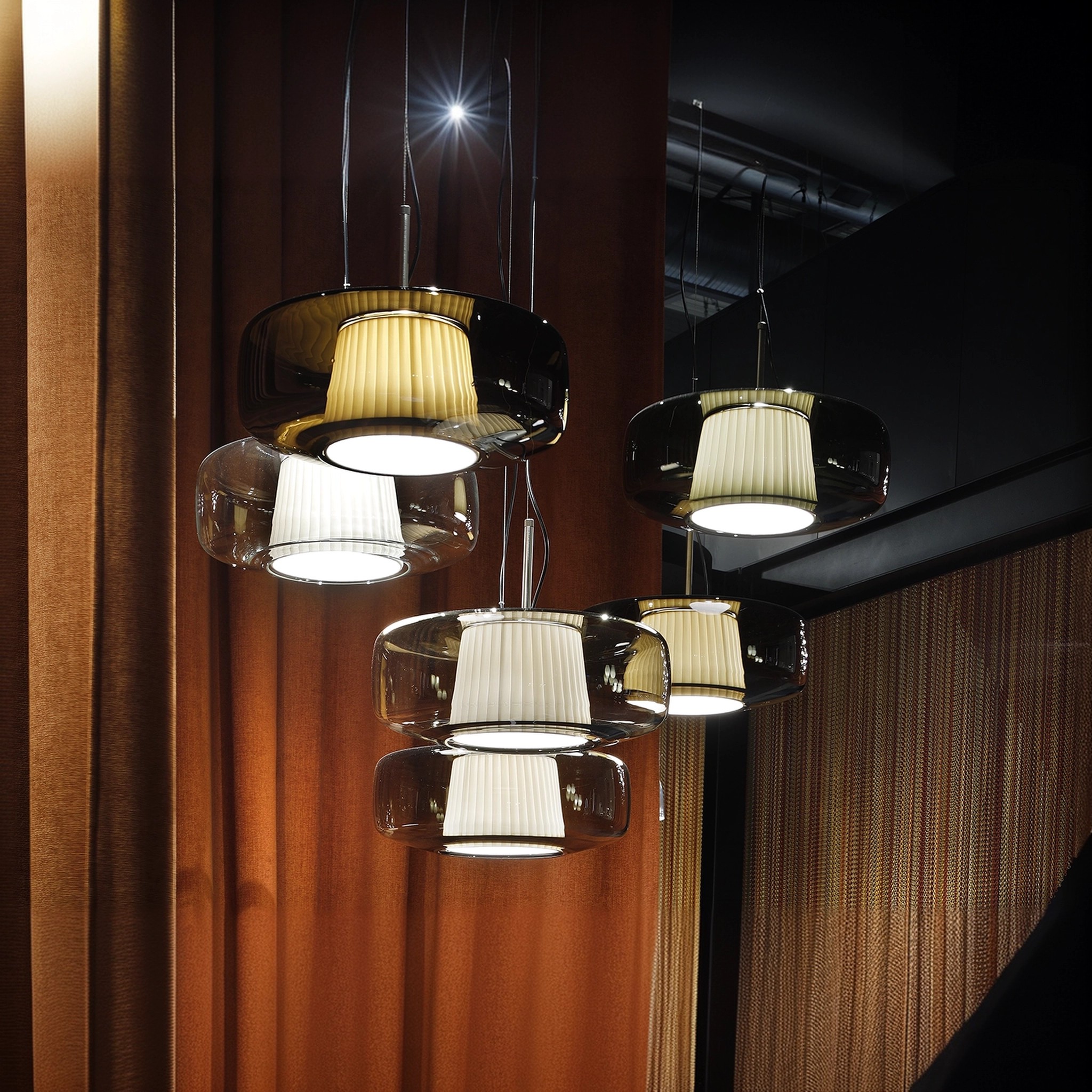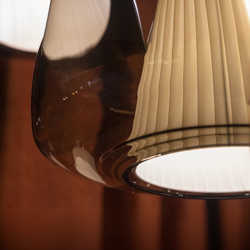 Выдувное стекло рассеивателя, которое имеет большие размеры, скрывает внутренний тканевый абажур и позволяет играть прозрачностью, цветом и текстурой, что делает Plissè элегантным изделием, способным придать жизнь и индивидуальность обстановке, в которой оно используется.