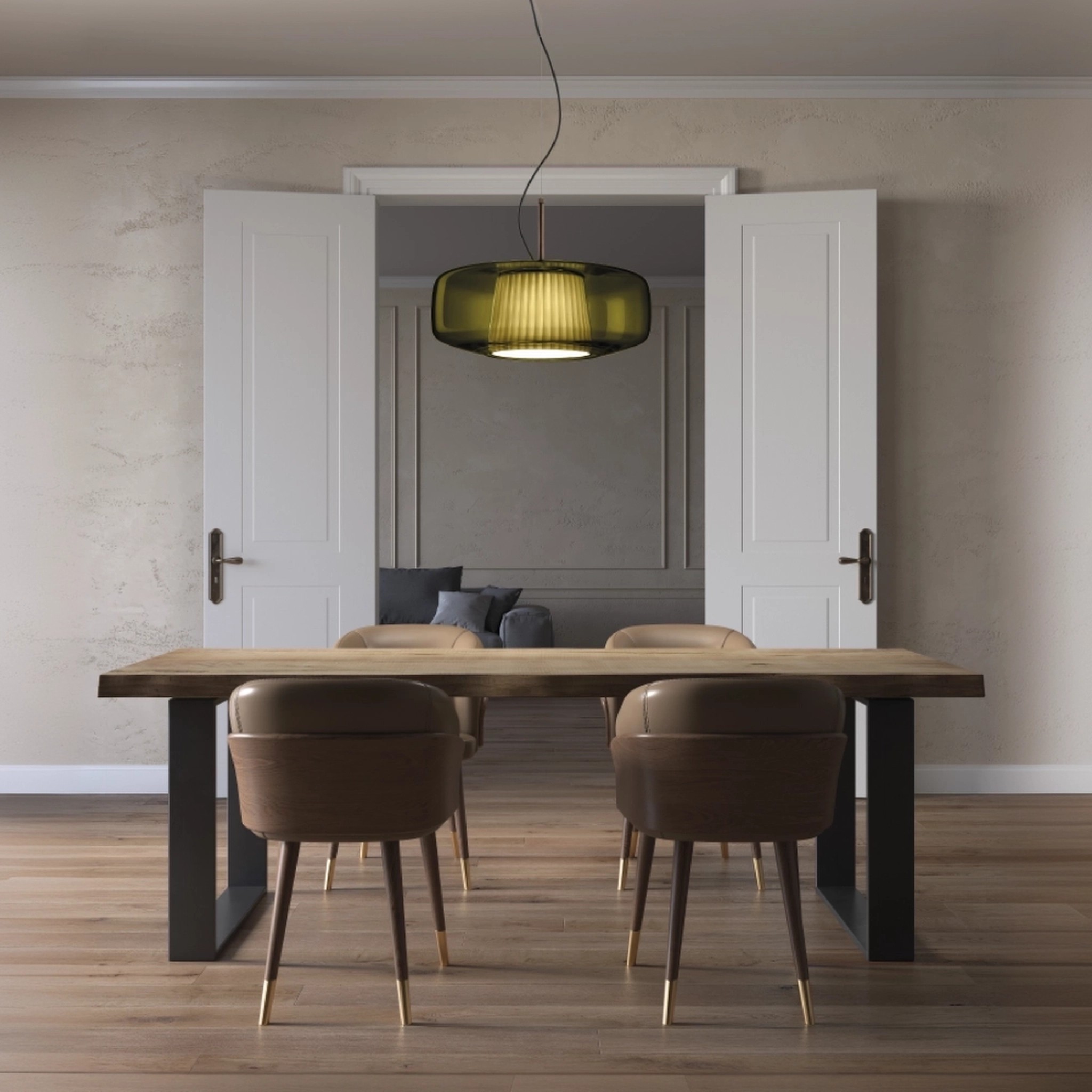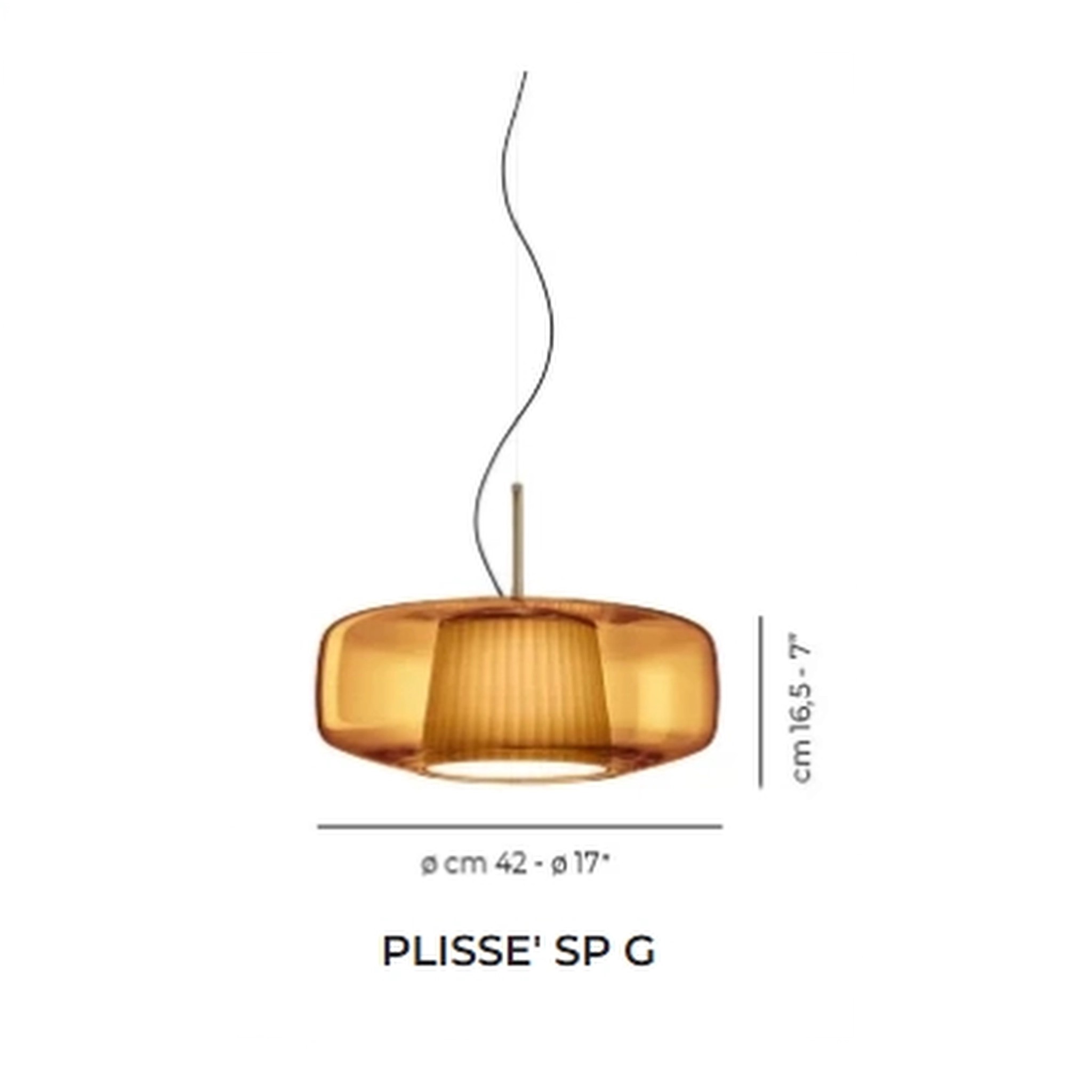 Plissè выпускается в виде подвески с рассеивателем из темного янтаря, дыма, терракоты, античного зеленого или прозрачного хрусталя. Металлическая рама может быть выполнена из матовой стали или бронзы.