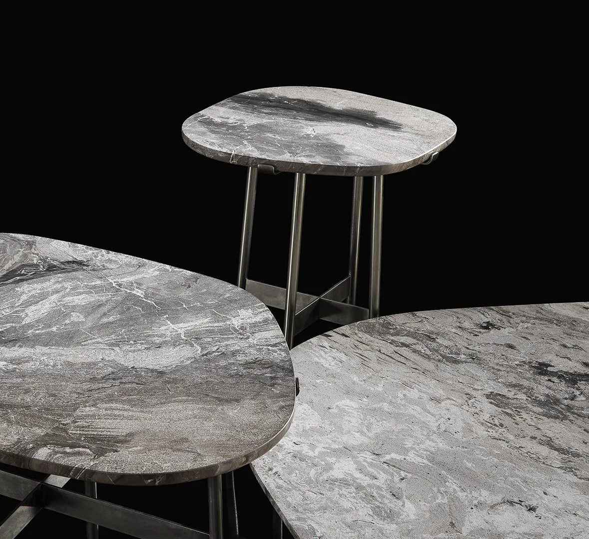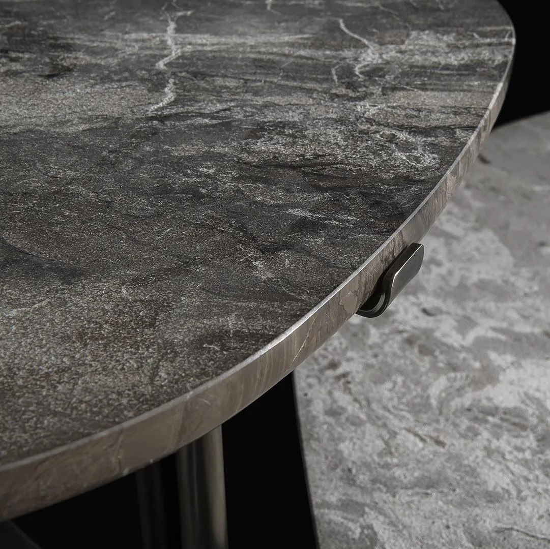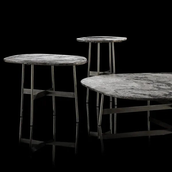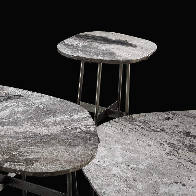 Тонкие и изящные ножки поддерживают каменную столешницу неправильной формы, подчеркивая грубую текстуру поверхности. Стремление заново открыть для себя чистоту камня и его подлинность.