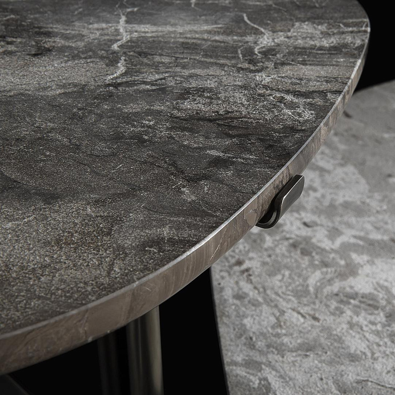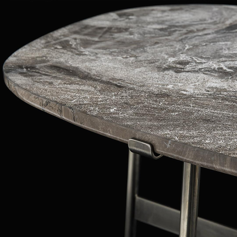 Стол изготовлен из мрамора с серебряно-коричневыми волнами.