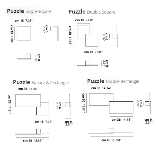 Четкие геометрические линии сливаются со стенами или потолком, освещая их мягким и уютным светом. Светильники-пазлы выполнены в различных вариантах: одинарный и двойной квадрат, прямоугольник и квадрат. Игра продолжается благодаря возможности размещать пазл в любом удобном месте в зависимости от имеющегося пространства и создавать индивидуальные световые эффекты. Основные формы светильников-головоломок идеально подходят для помещений, выдержанных в ярко выраженном современном стиле, создавая гармоничное и успокаивающее фоновое освещение.