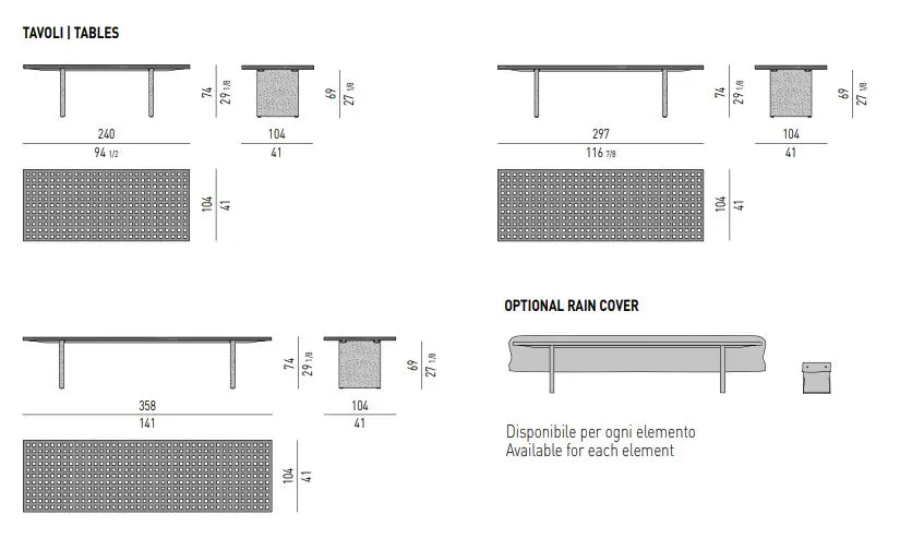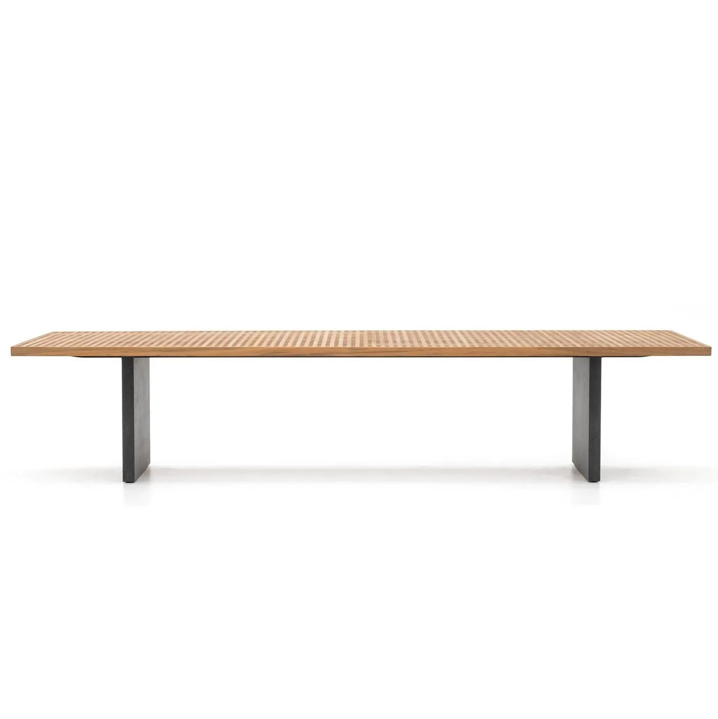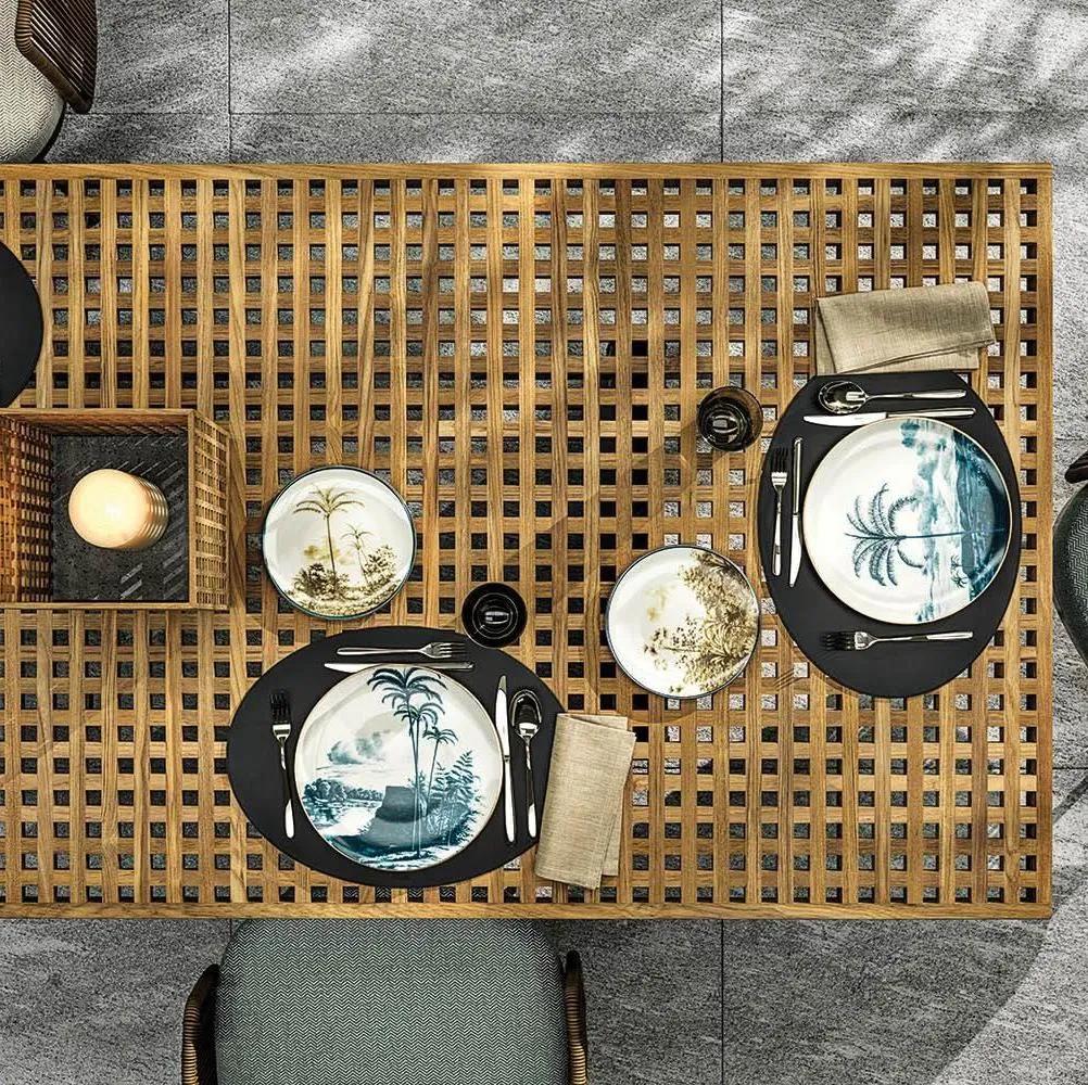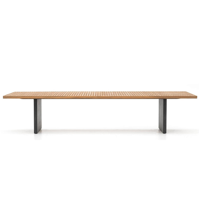 Стол представлен в трех размерах и оснащен столешницей на алюминиевых ножках, выполненной в виде двух панелей, пересекающих его с короткой стороны. Столешница выполнена с эффектной порошковой отделкой из лавового камня, создающей интересный контраст между поверхностями и столешницей из тикового дерева.