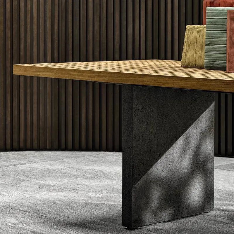 Рационалистичный, минималистичный, разработанный с использованием различных материалов и текстур, которые подчеркивают его линейные формы, стол украшен элементом, характерным для семейства Quadrado , - рисунком в виде "утиной доски" ("дощатый настил").