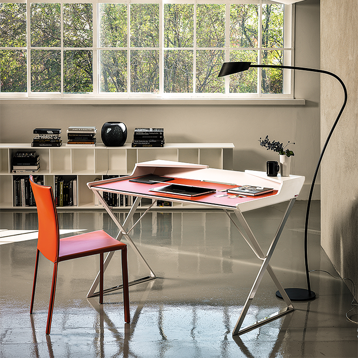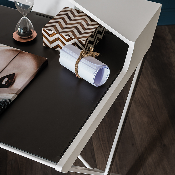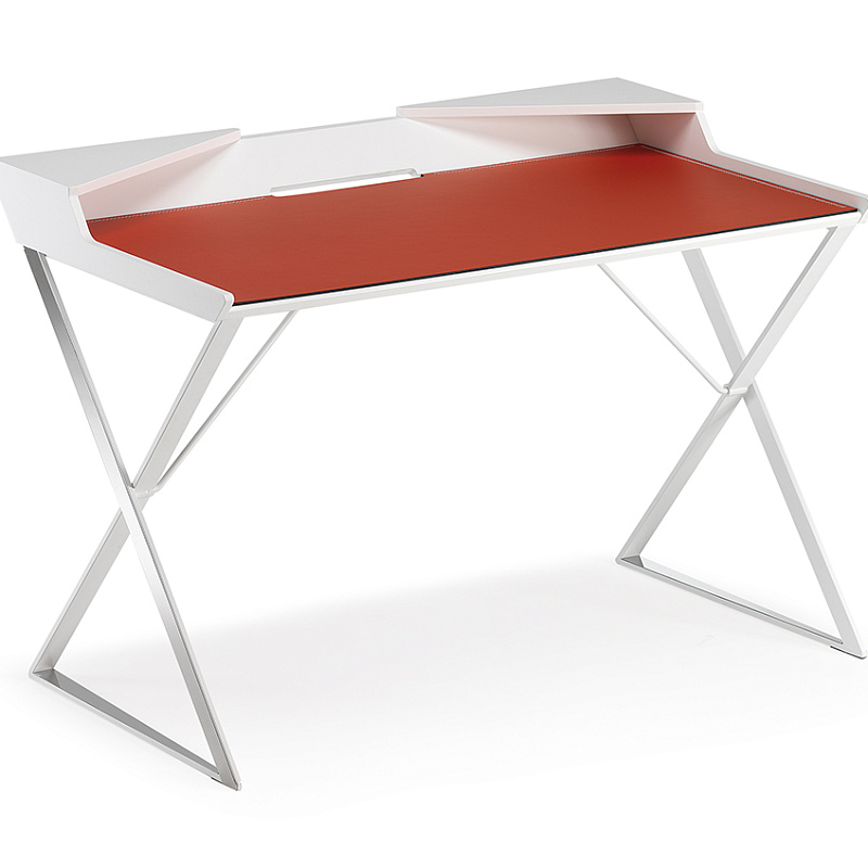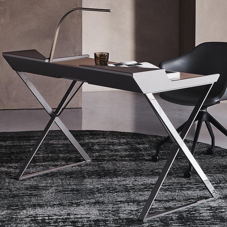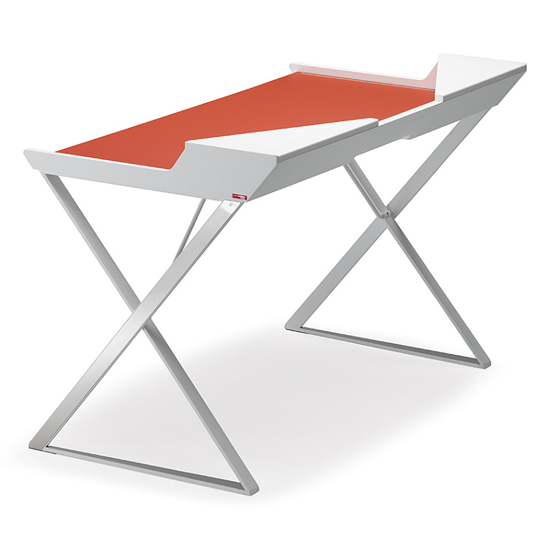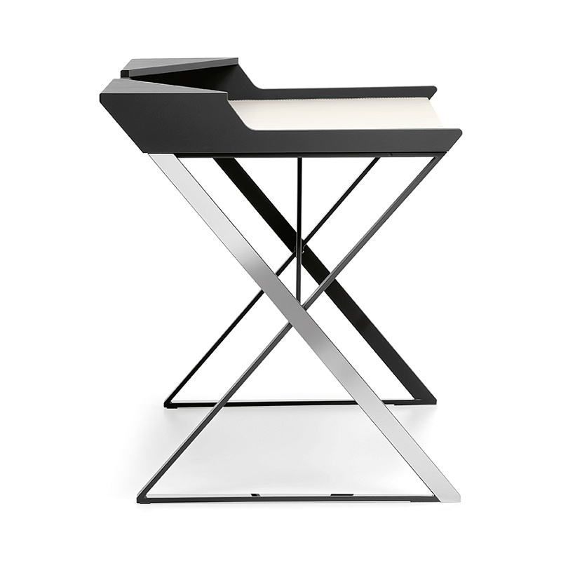 Выделяющийся геометрическими линиями, создающими ощущение тщательно продуманного баланса, дизайнерский письменный стол Qwerty, как будто, парит над тонкими стальными ножками, скрещенными в форме X. Кожаная накладка, доступная в различных цветах, дополняет стальную поверхность, делая ее удобной и элегантной.