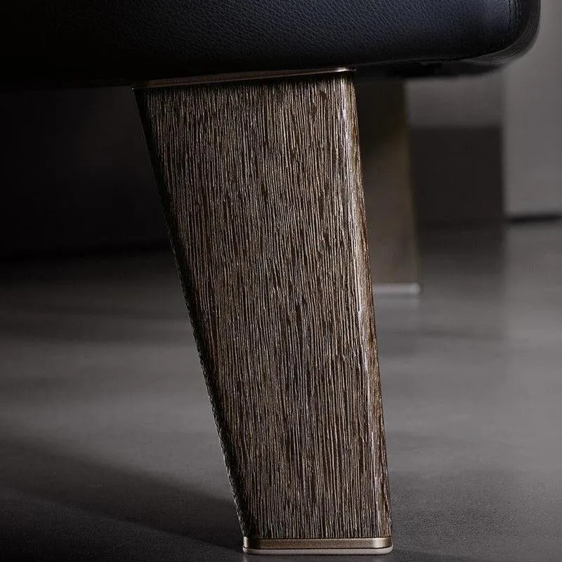 Спинка дивана опирается на изящные изогнутые металлические опоры, окрашенные в глянцевый светло-бронзовый цвет, а передняя часть дивана Reeves “Lounge” установлена на ножках из массива дерева Сукупира с отделкой в цвет мореной норки. Верхняя и нижняя части ножки дополнены металлическими деталями, окрашенными в светло-бронзовый цвет, - элементами, которые в полной мере отражают мастерство, проверенное временем.