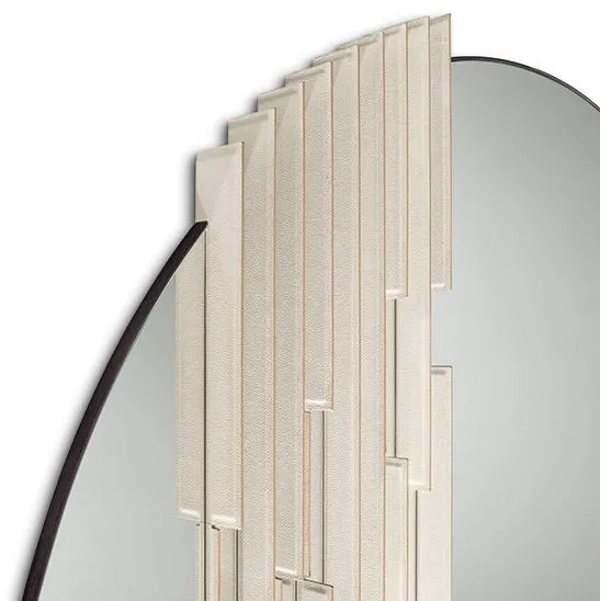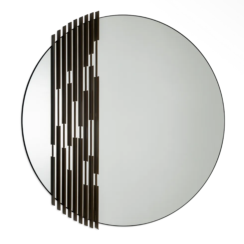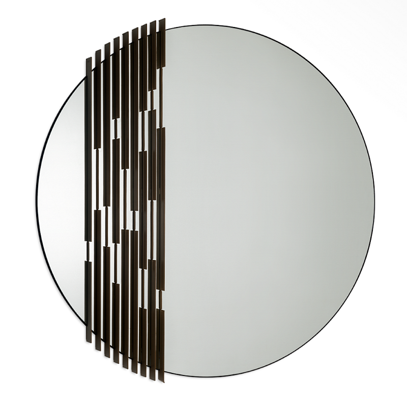 Настенное зеркало с боковым профилем из массива ясеня, имеющее антрацитово-серую отделку. Зеркало разделено небольшими накладками, выполненными из кожи двух цветов или окрашенными в бронзовый цвет, и может быть установлено справа или слева.