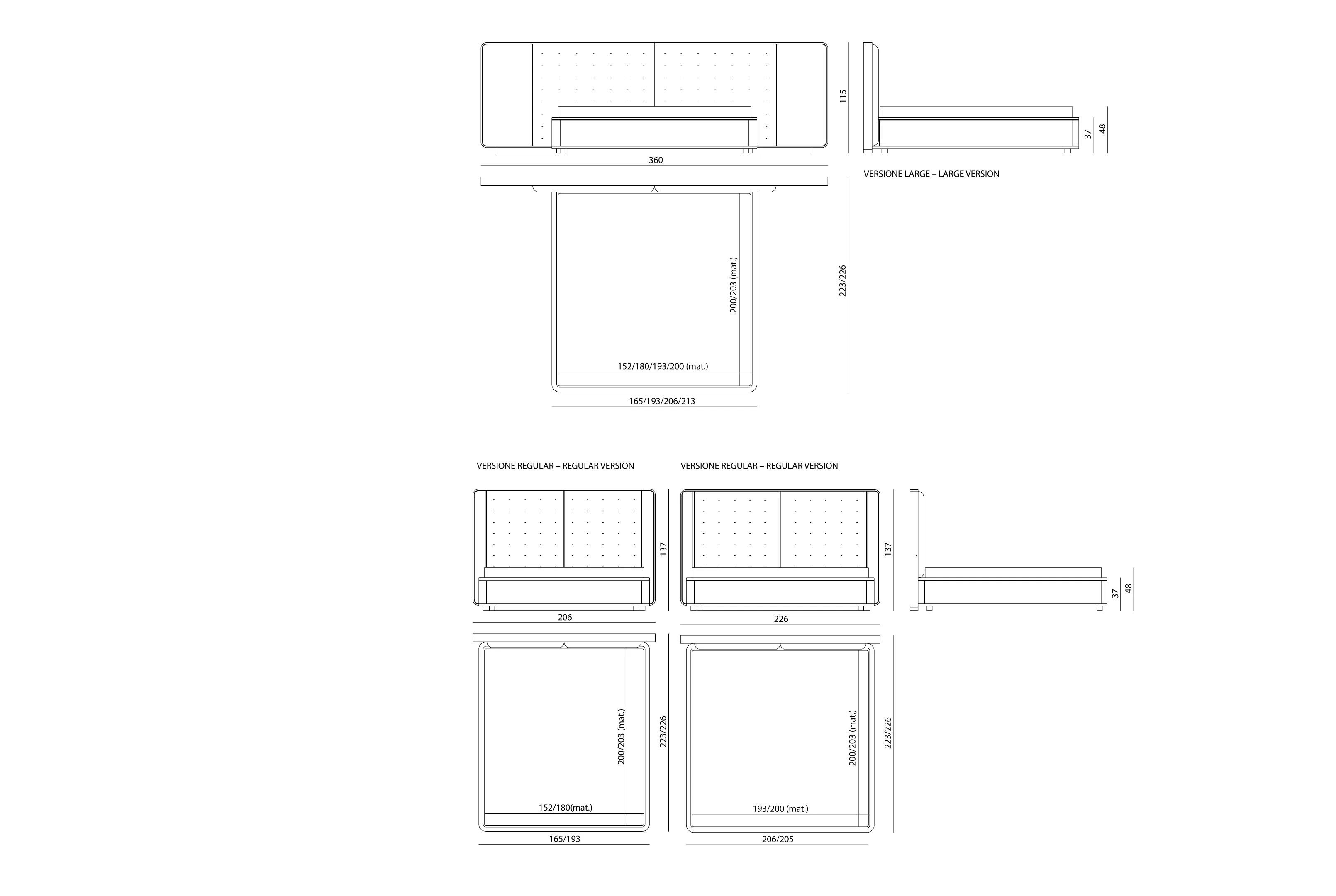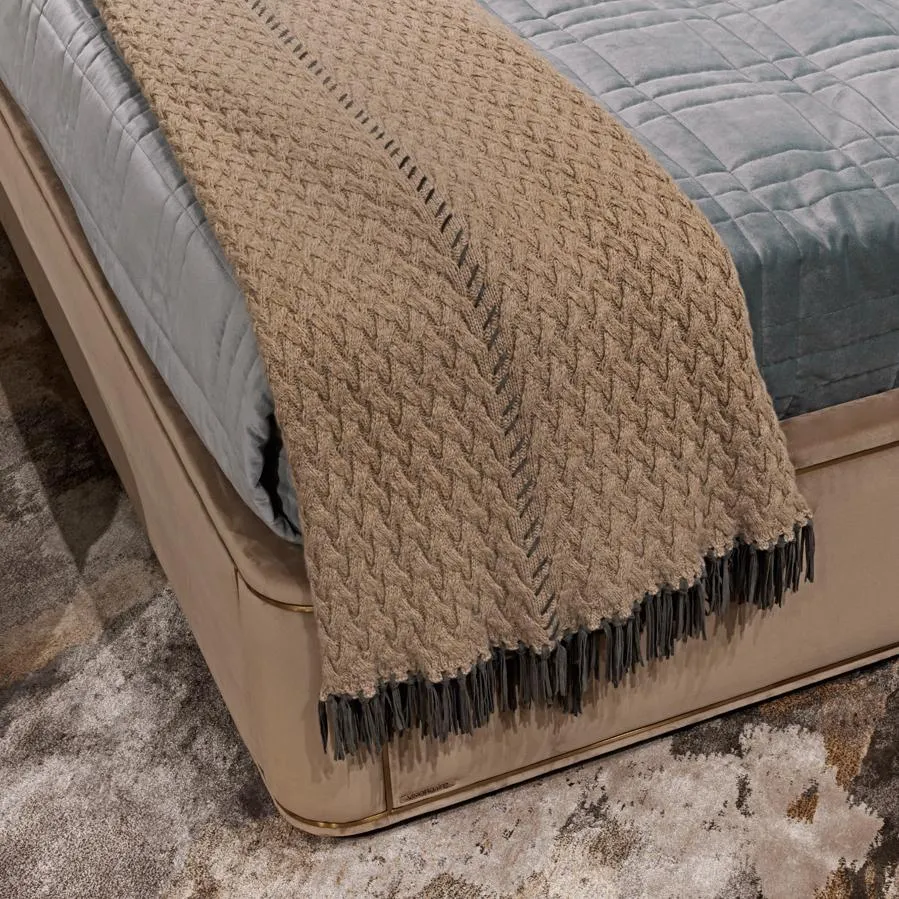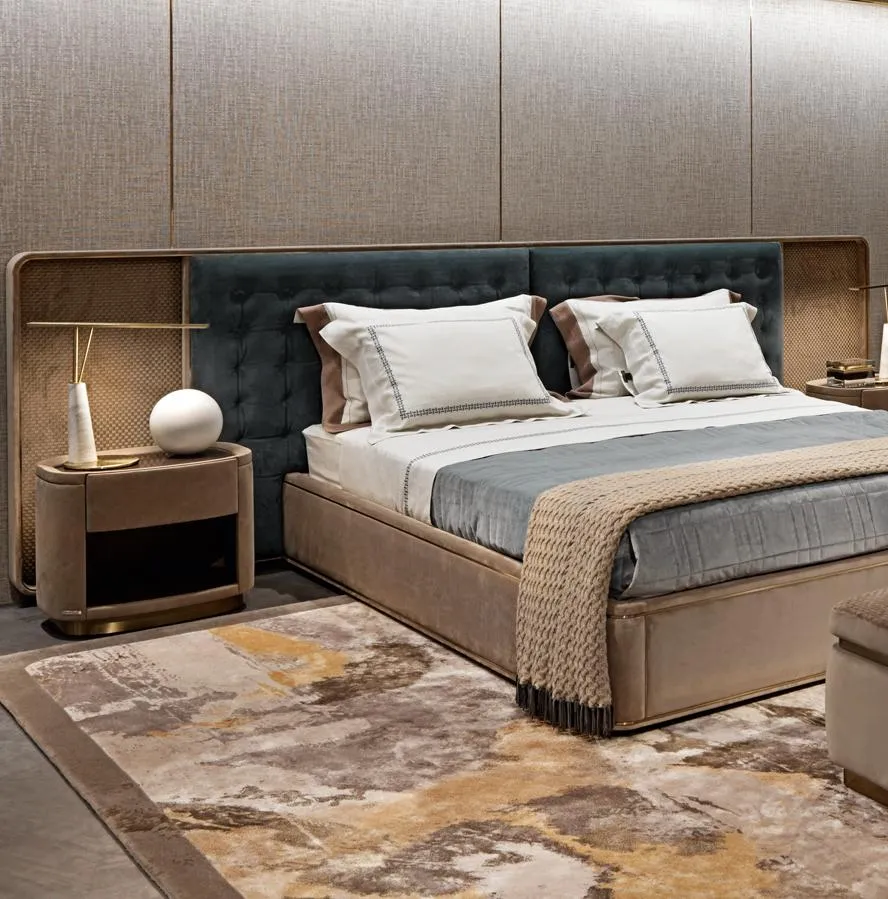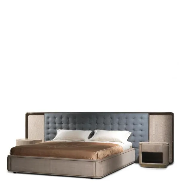 Каркас кровати выполнен из кожи или ткани и инкрустирован латунными профилями. Внутренняя конструкция выполнена из цельного и многослойного дерева. Предусмотрена возможность установки деревянных планок, поддерживаемых четырьмя угловыми кронштейнами и одним центральным стержнем с регулируемой высотой.